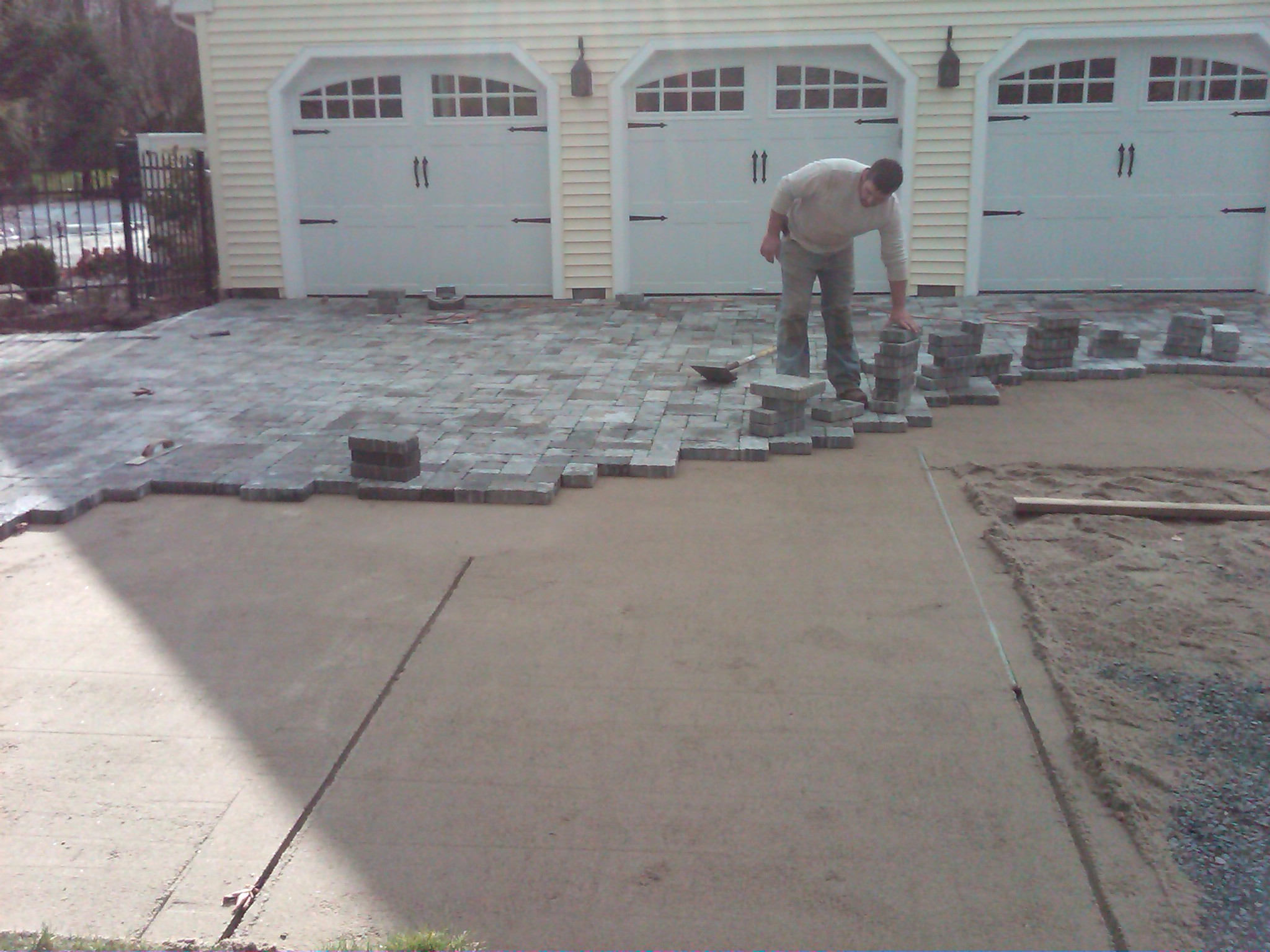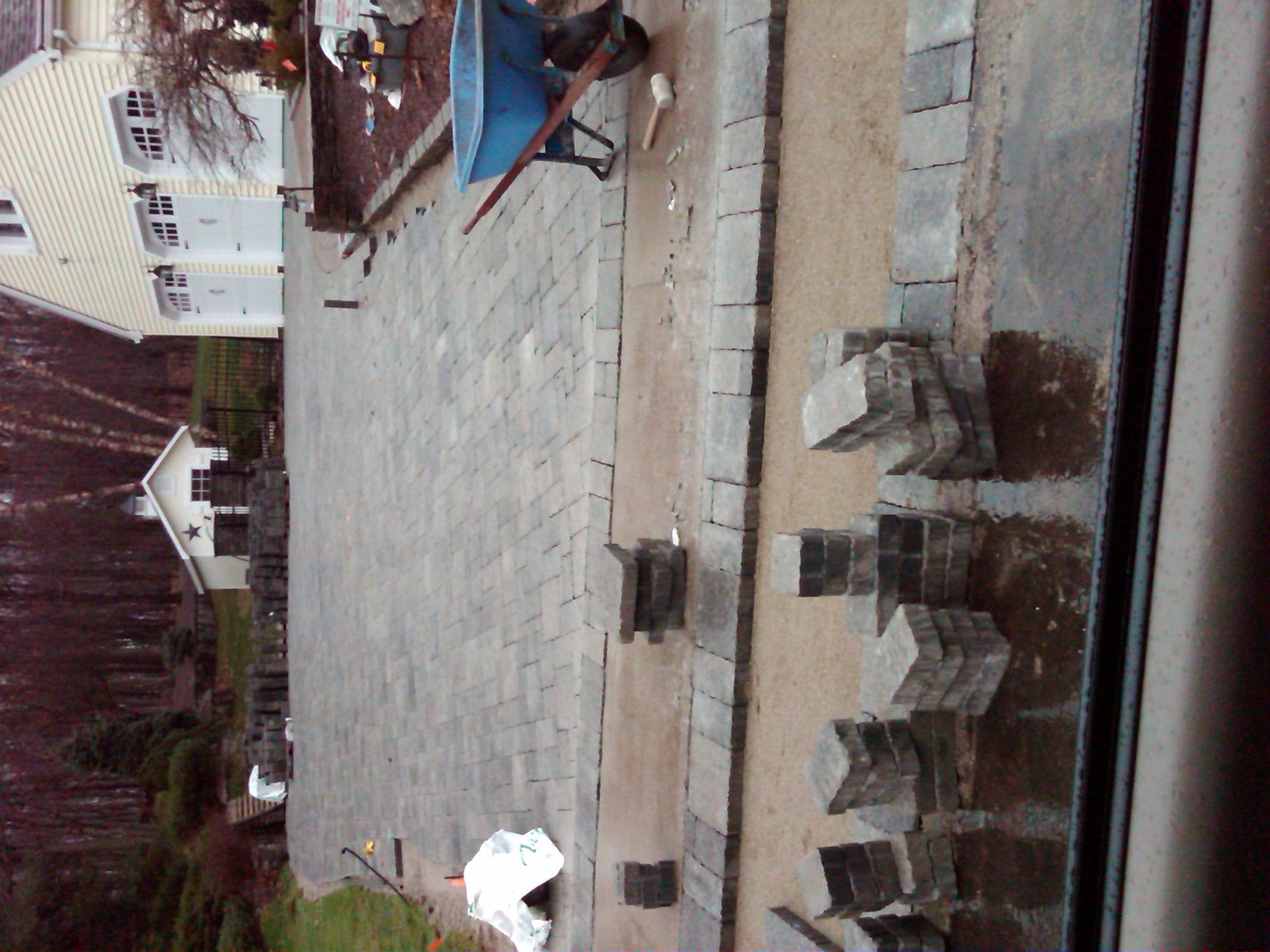 Preferred Properties Landscaping installed this paver driveway after taking up the asphalt driveway that failed after just three years. A typical asphalt drive is rolled bituminous on a compacted process base. In this scenario hydraulic pressure and water seepage ran down from the embankment and undermined the asphalt base. This paver driveway was installed ontop of a 1 1/4″ crushed stone base and geo grid fabric under layment to keep the soil from contaminating the process base. After careful consideration of the water issue and lots of stone, the upper base begins to be put into place.