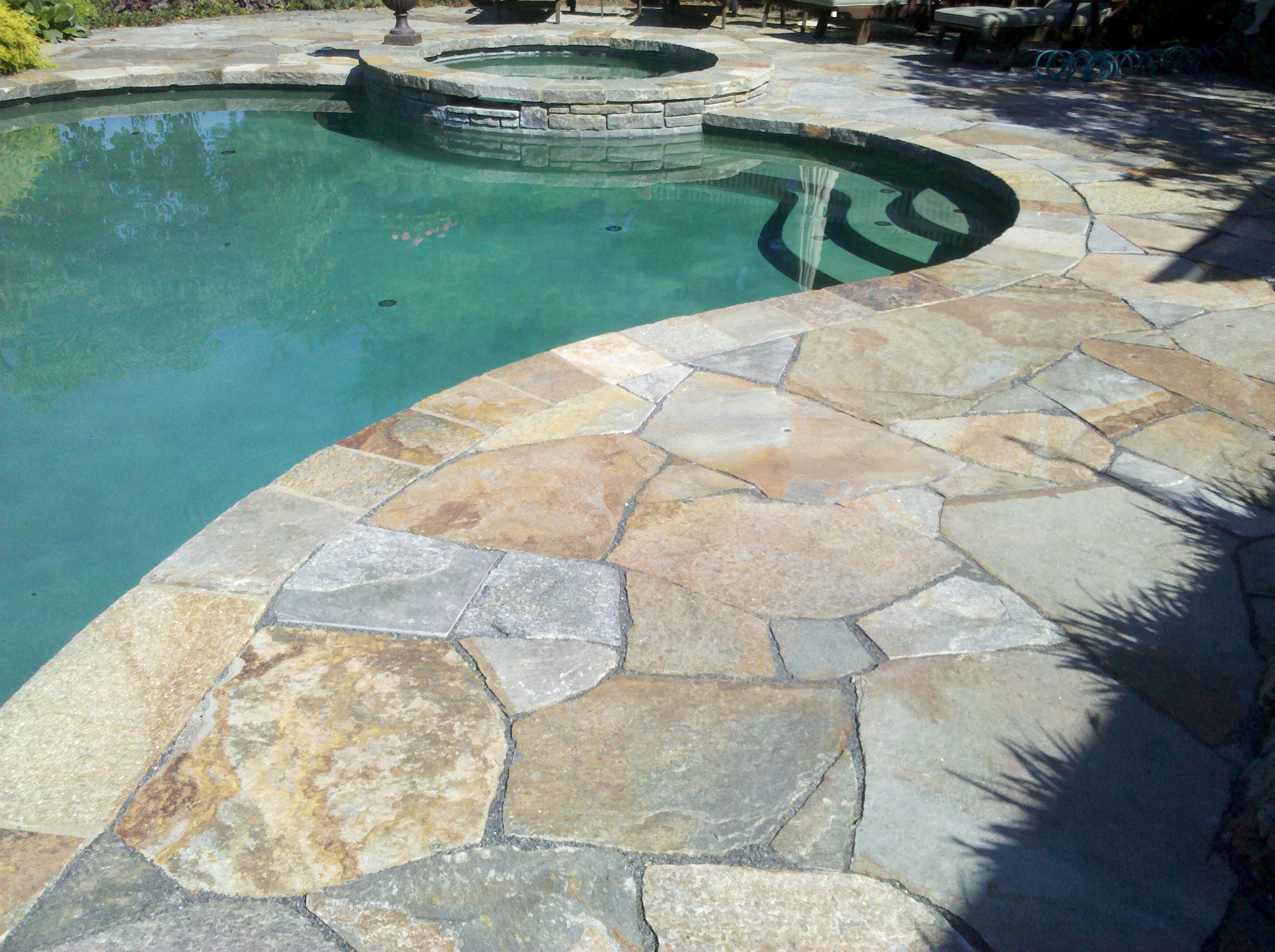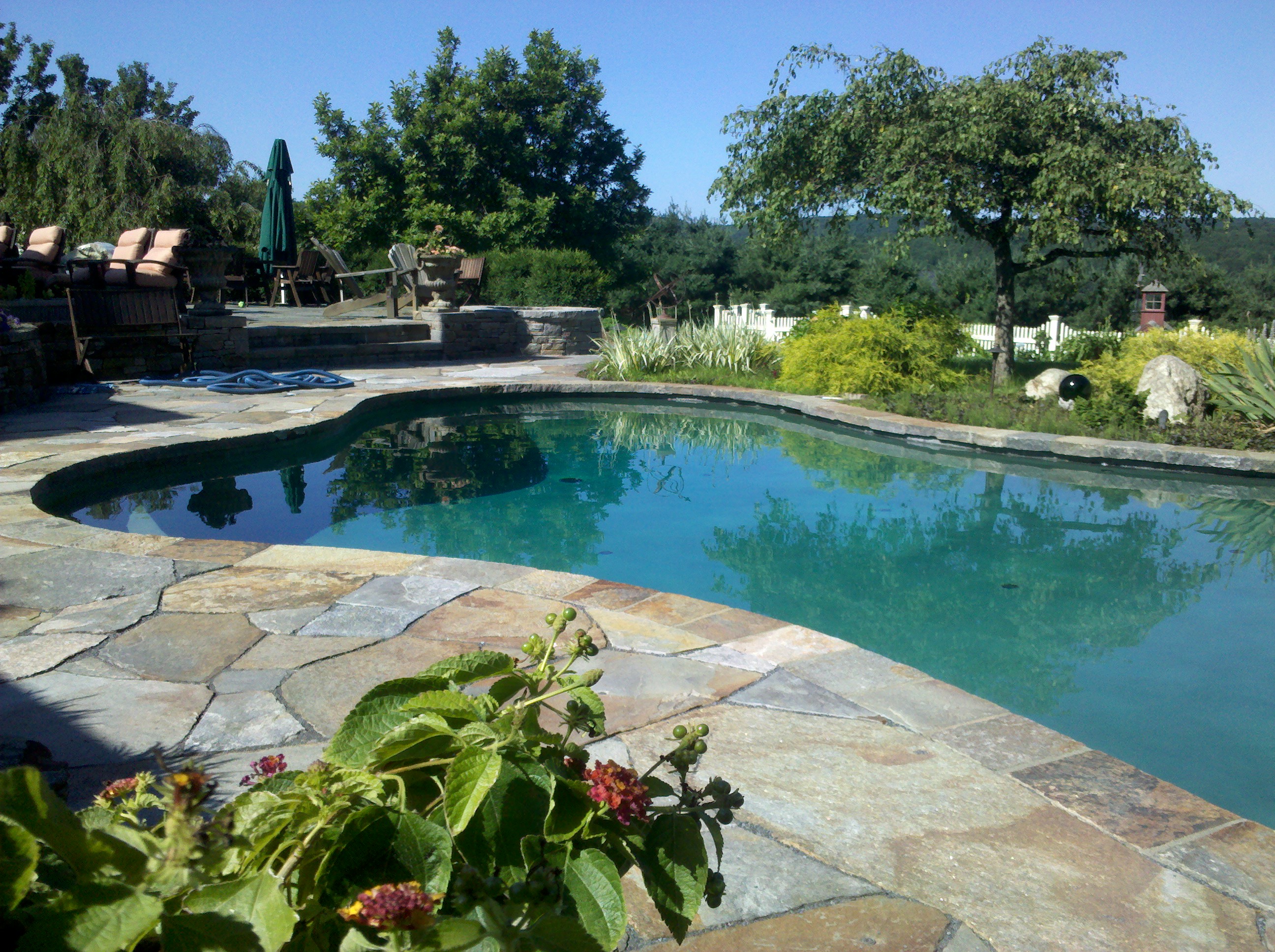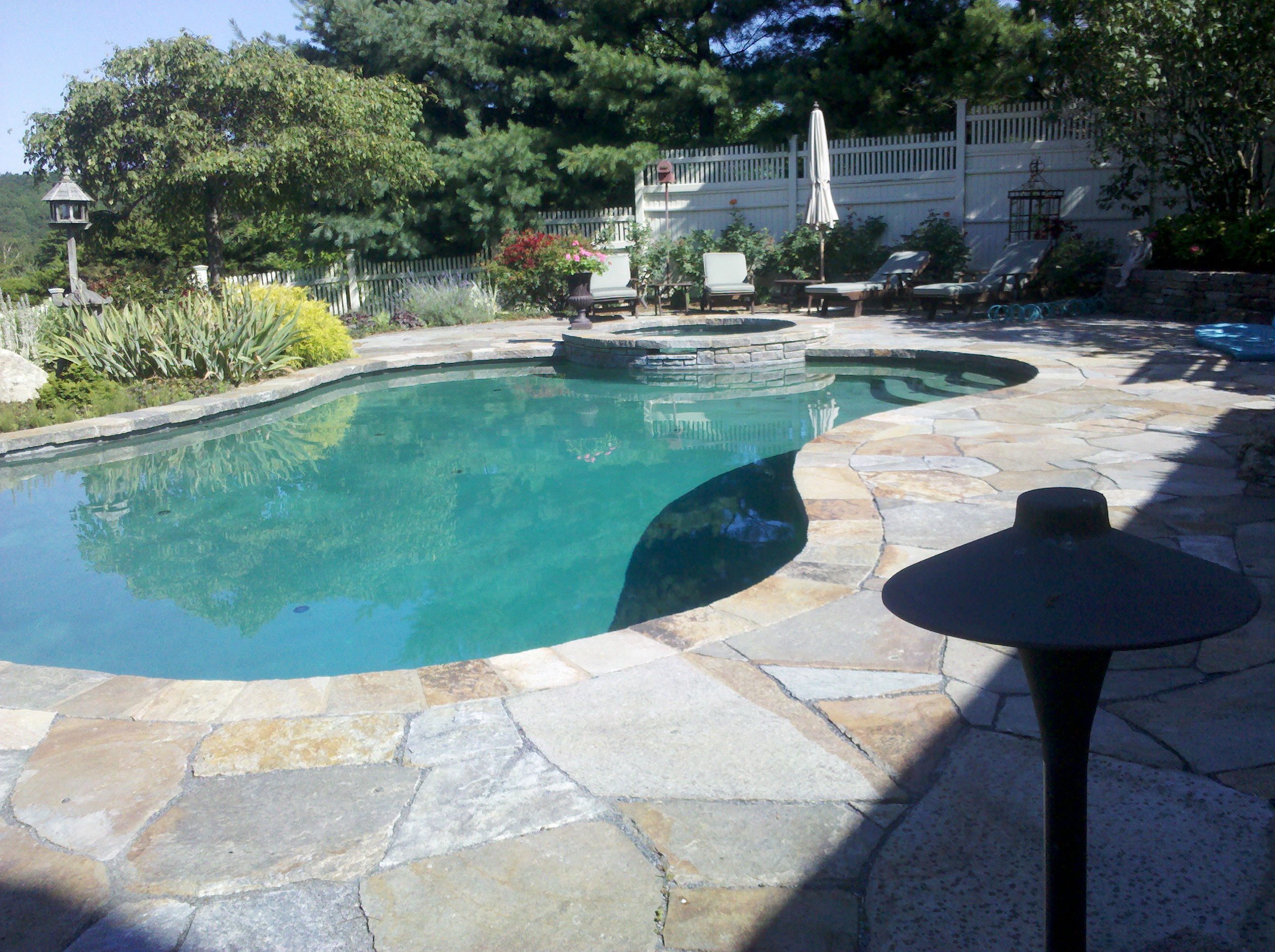 this pool patio. The integrity of the stone has a tendency to deteriorate over time. Required maintenance is essential and could be a bit costly at times. However it is the least expensive approach to keeping your pool patio looking and feeling new. Go onto http://www.outdoorlivingCT.com to see more projects by outdoor living designer Michael Gotowala of Preferred Properties lsc and masonry