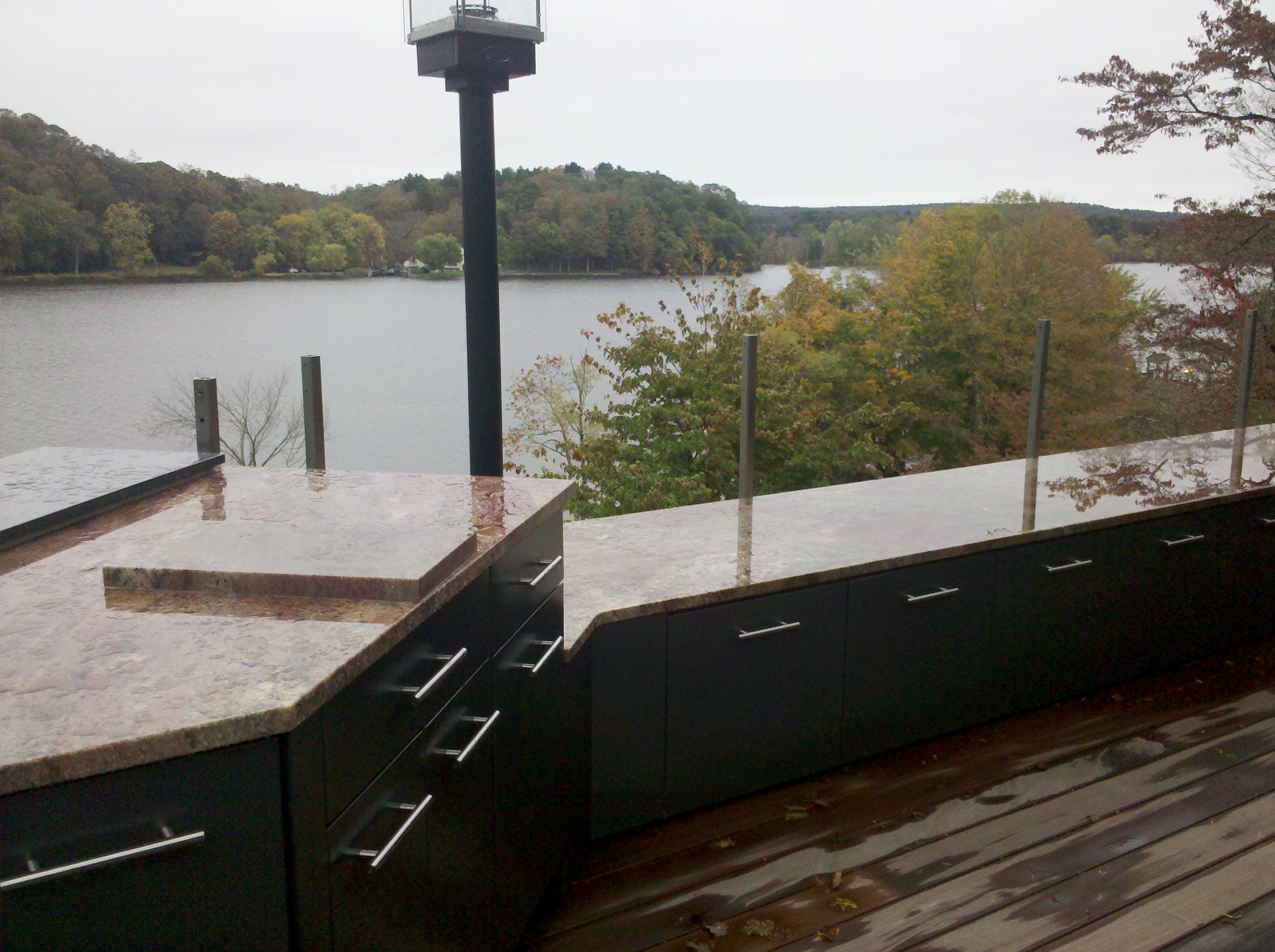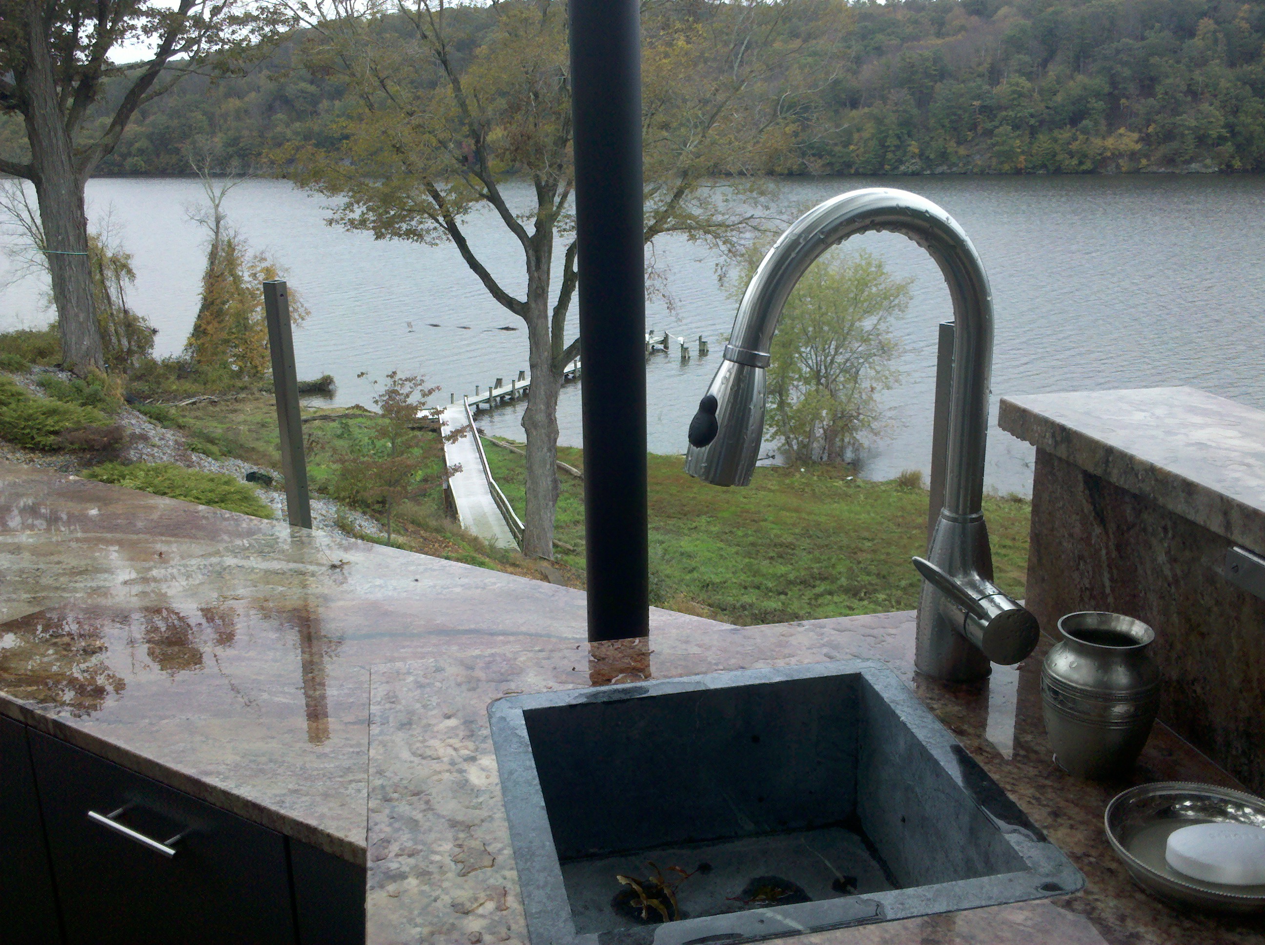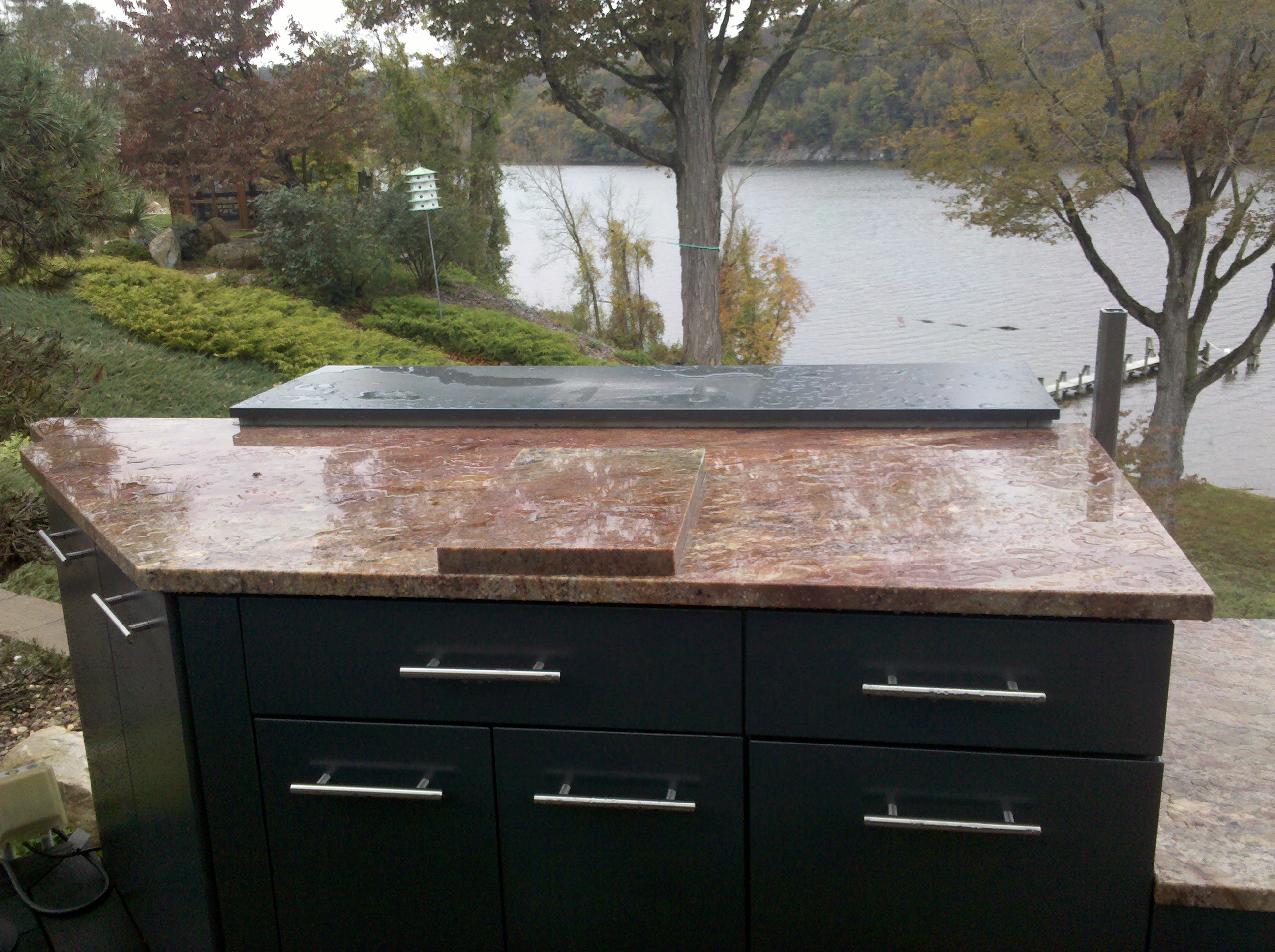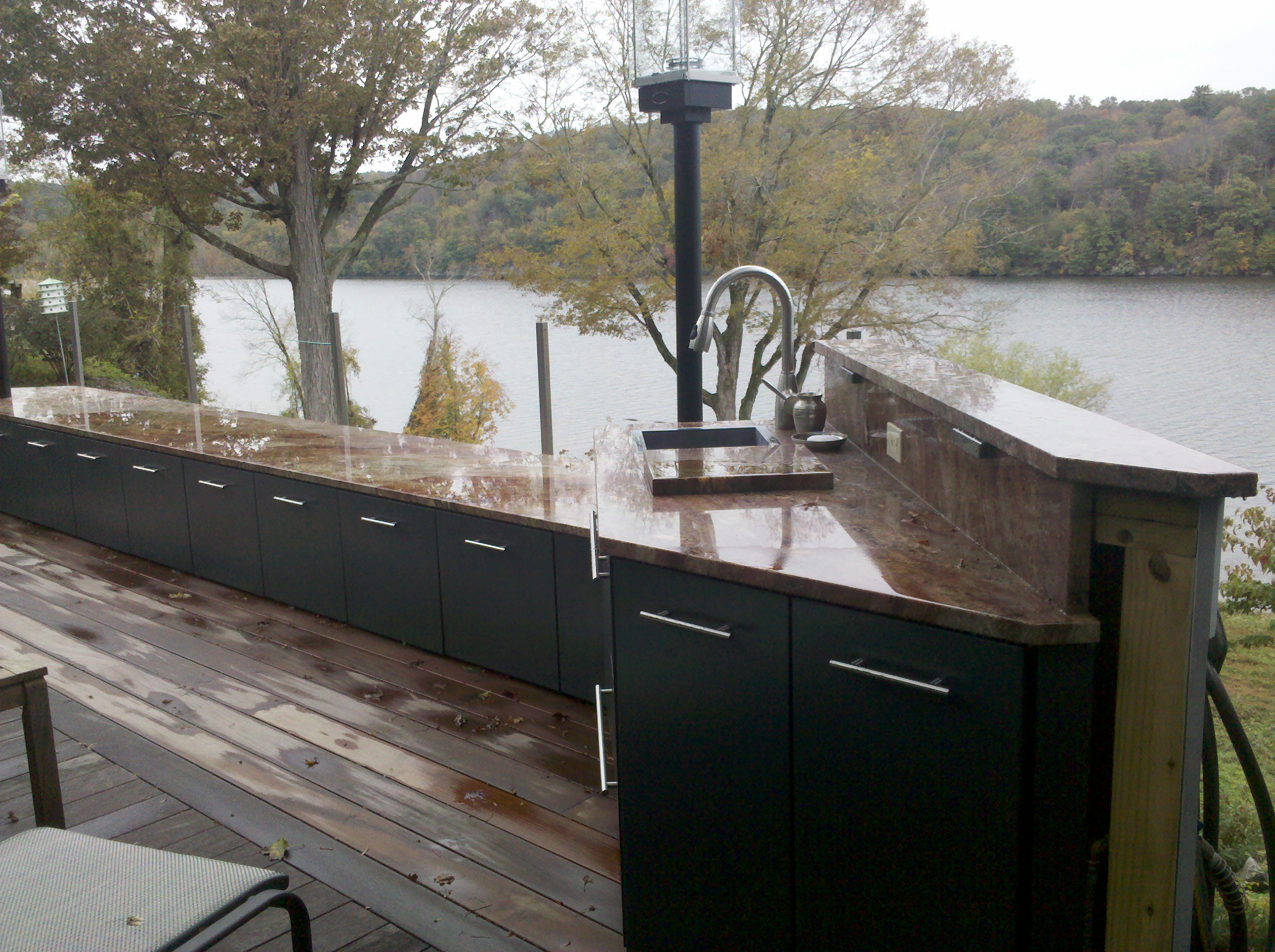 One of the best features of this project was the stainless cabinetry from DANVER, which they delivered perfectly powder coated to homeowner desires. The challenge of the deck expansion was to incorporate home builder to expand deck in a tray like platform so the 30″ cabinetry was lowered eight inches not to obscure the view of the water. This meant Danver designers had to meet with the homeowners, and Outdoor kitchen designer Michael Gotowala as he insisted raising cabinetry doors to achieve fullest storage capacity. The tray firmly held the panaramic cabinetry in place while supporting the magnificent granite bench slabs..anchoring the left side was a pop up outdoor TV controlled by switch from the inside of the house. The right side with fully functional outdoor sink. This soapstone sink is unique in itself for the one piece shape and soapstone material. Staying amongst the Japanese garden theme, outdoor kitchen designer Michael Gotowala suggested tempest torches, again control with finger tip control switch.