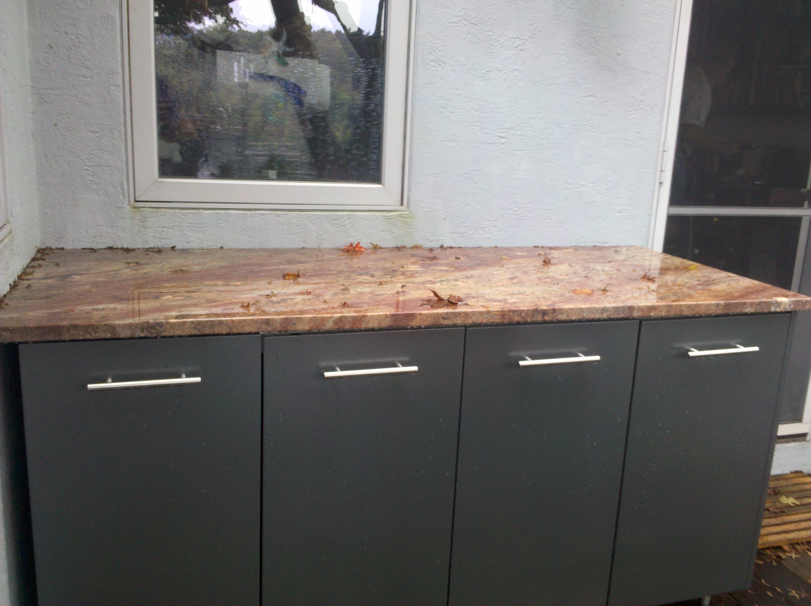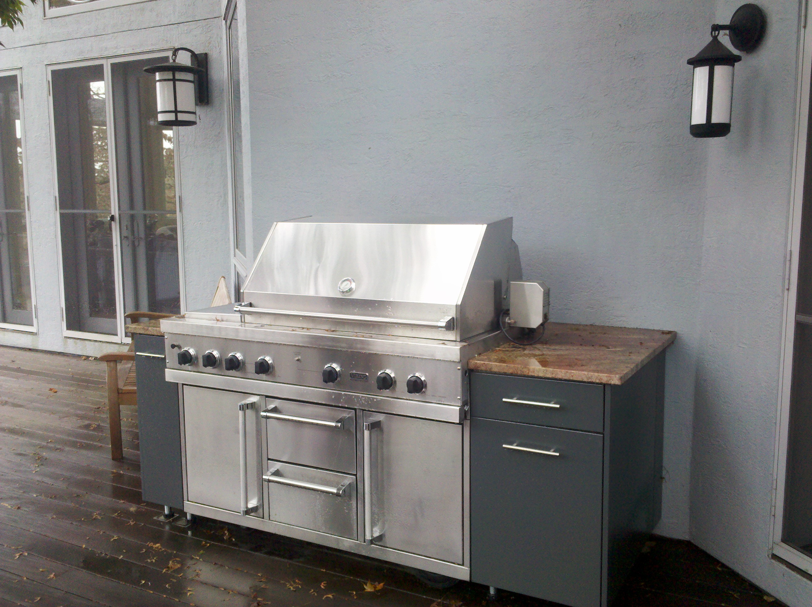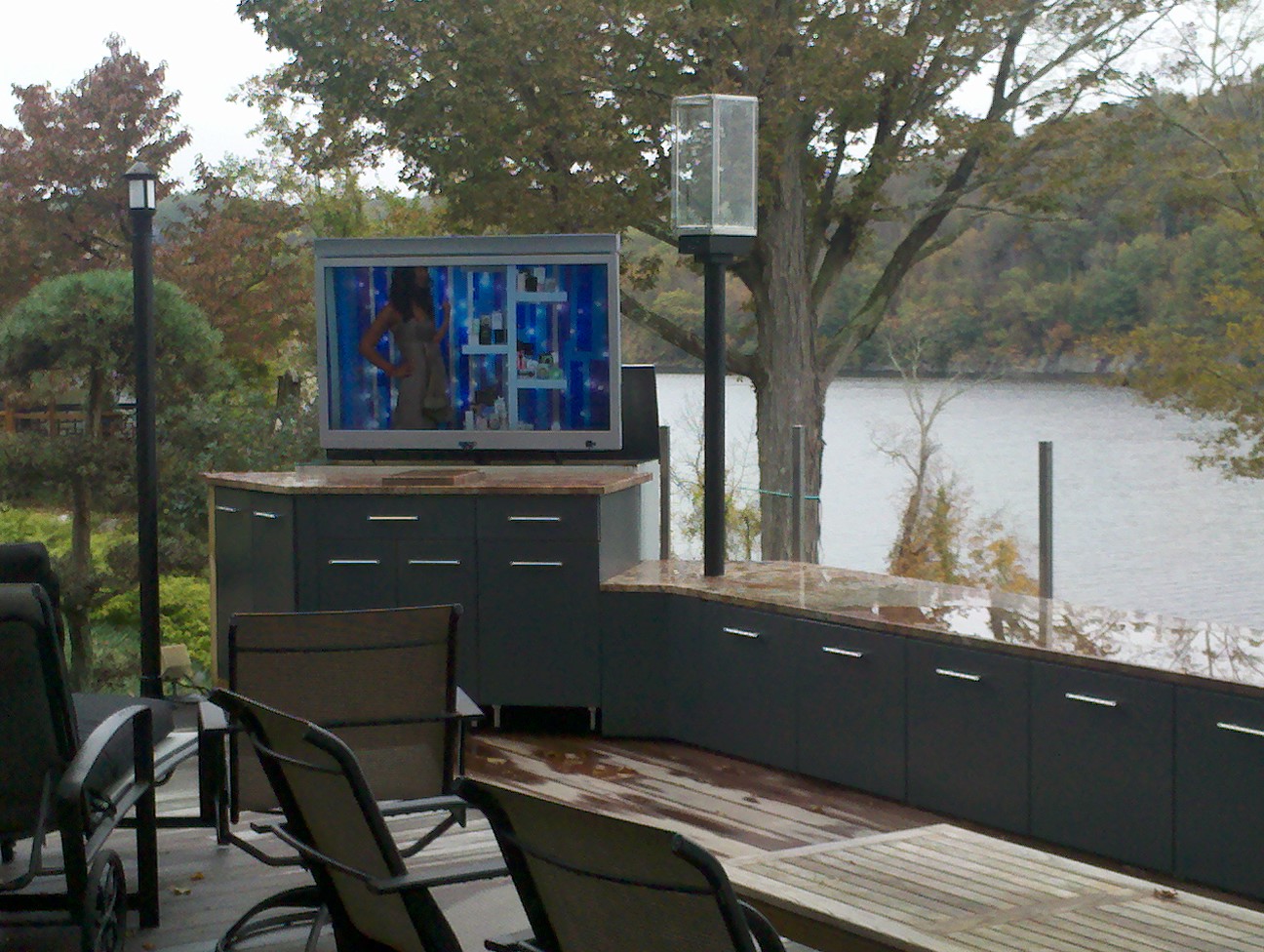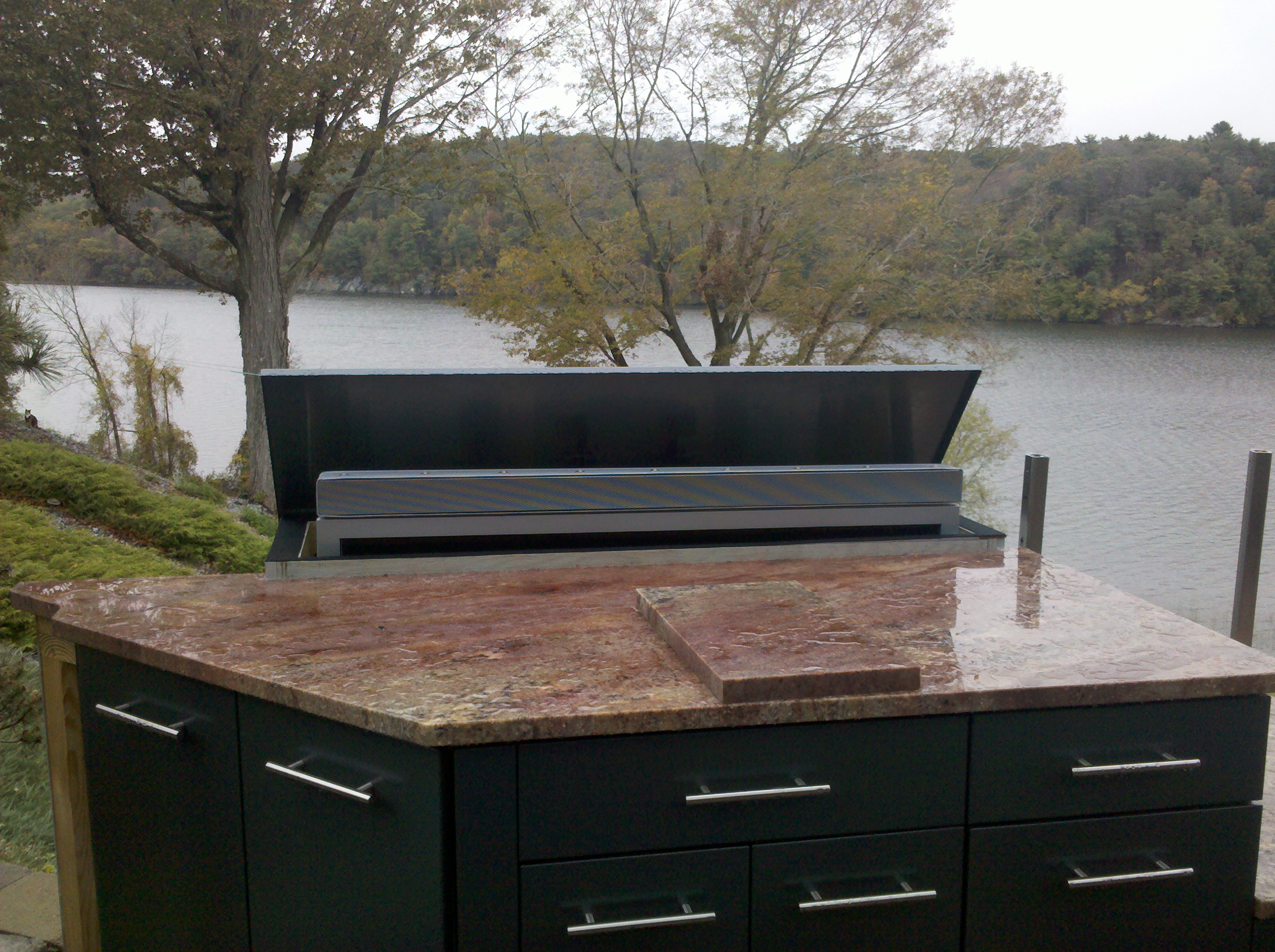 One of the best features of this project was the stainless cabinetry from DANVER, which they delivered perfectly powder coated to homeowner desires. The challenge of the deck expansion was to incorporate home builder to expand deck in a tray like platform so the 30″ cabinetry was lowered eight inches not to obscure the view of the water. This meant Danver designers had to meet with the homeowners, and Outdoor kitchen designer Michael Gotowala as he insisted raising cabinetry doors to achieve fullest storage capacity. The tray firmly held the panaramic cabinetry in place while supporting the magnificent granite bench slabs..anchoring the left side was a pop up outdoor TV controlled by switch from the inside of the house. The right side with fully functional outdoor sink. This soapstone sink is unique in itself for the one piece shape and soapstone material. Staying amongst the Japanese garden theme, outdoor kitchen designer Michael Gotowala suggested tempest torches, again control with finger tip control switch.