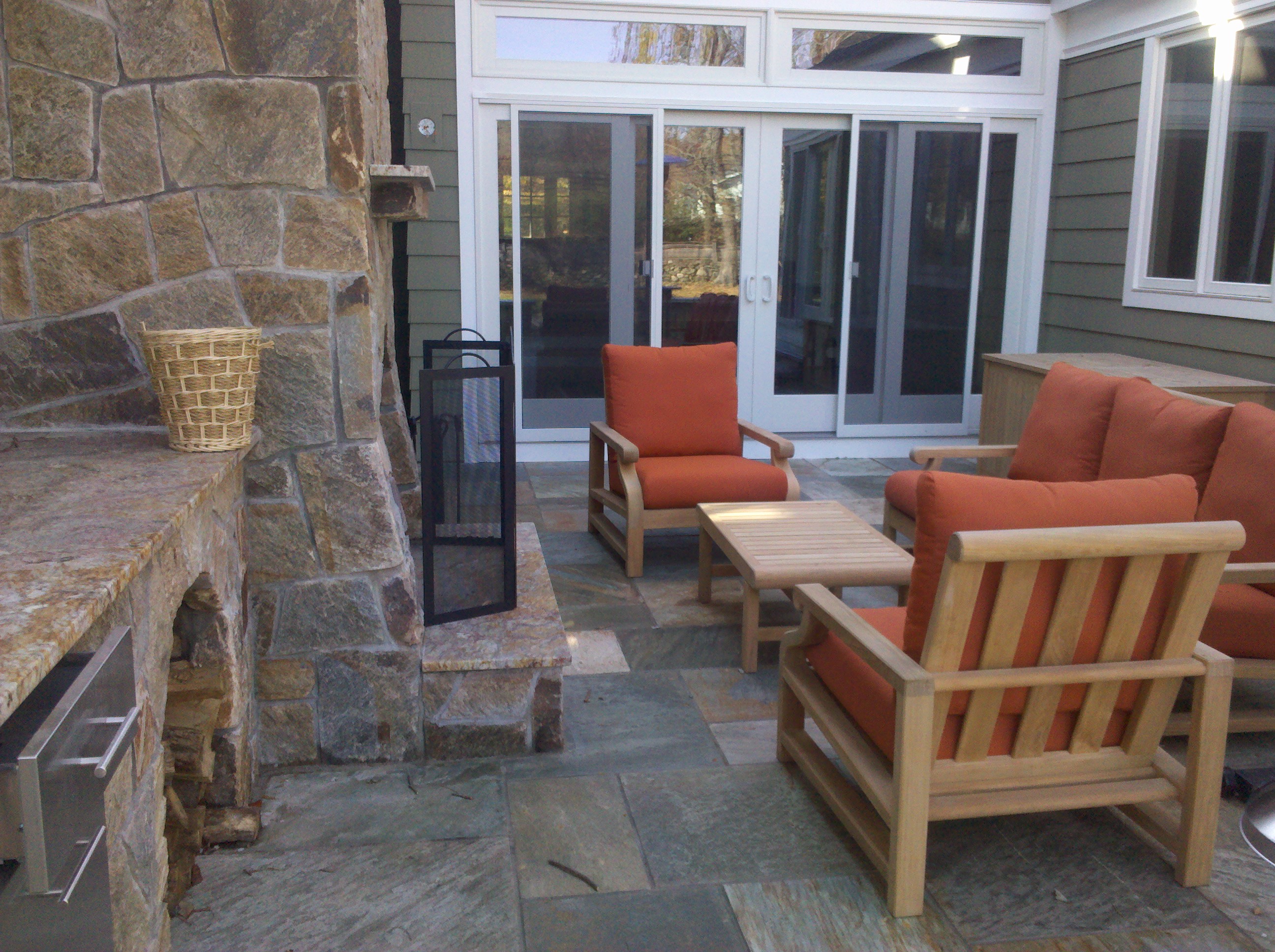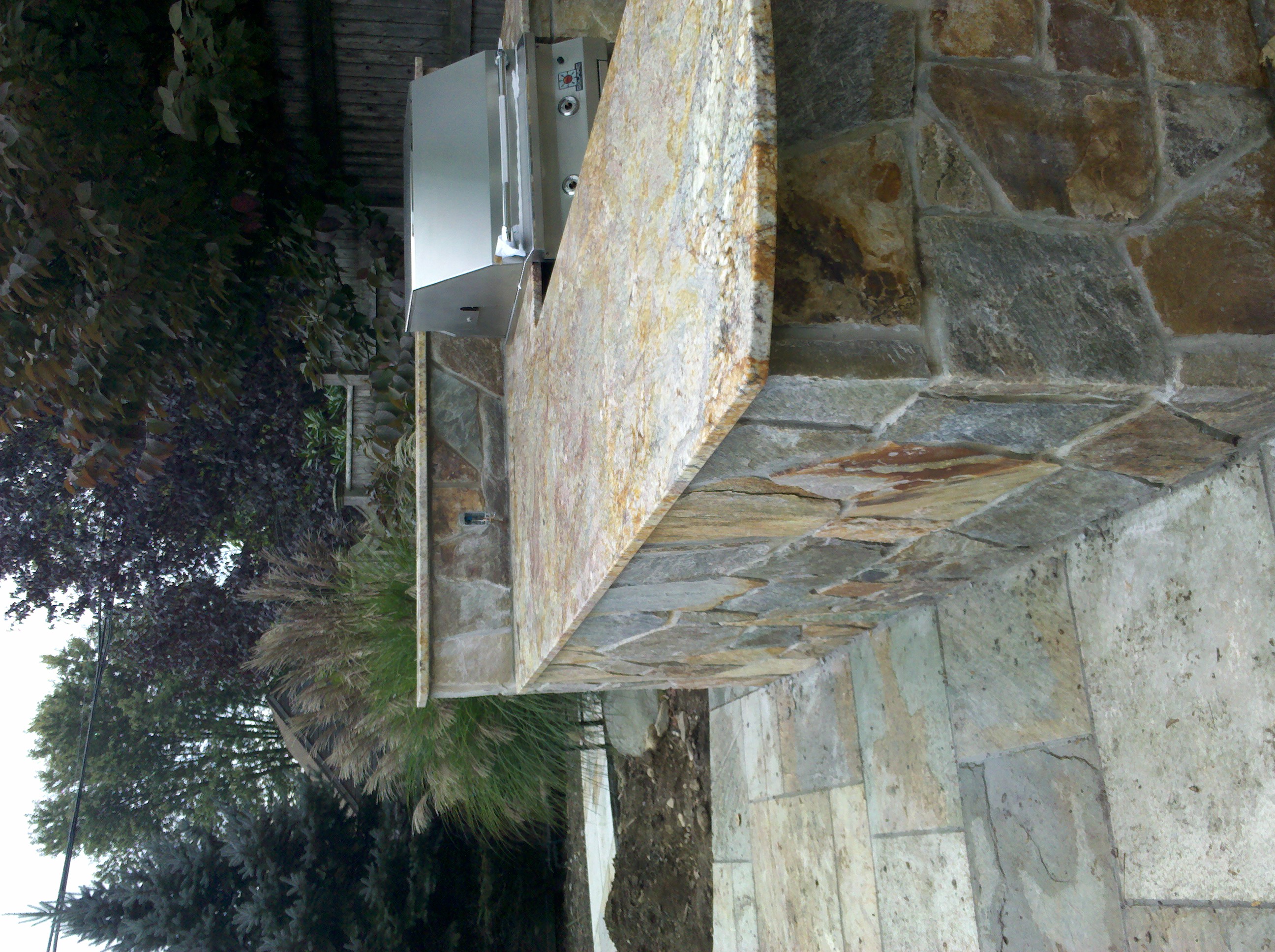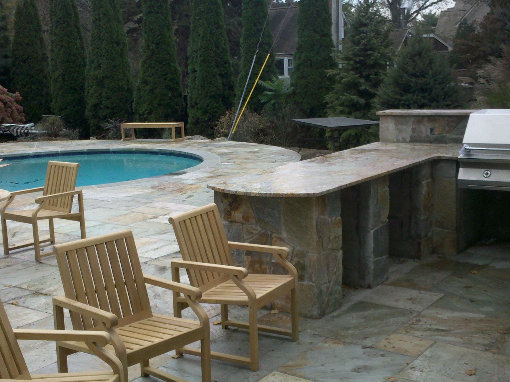 Preferred Properties principal outdoor living designer and outdoor kitchen builder extends his vision well beyond the walls of this Westport Connecticut residence. With over 26 yrs as a landscape designer and masonry specialist, Michael Gotowala’s design build team at PREFERRED PROPERTIES LSC, Inc has been consistently exceeding customer expectations on artistic vision, masonry excellence and overall wow factor in outdoor living. This outdoor living project features an outdoor fireplace with curved stone bins, flanked by an outdoor stainless steel audio storage cabinet and refrigerator topped of with leatherette slabs. Certain details standout as in the queen Anne’s slanted stone legs holstering the outdoor fireplace. Spectacular stone and Norwegian buff random patterned decking upholds the Patio, terrace, spa area, pool patio and outdoor kitchen area. Color ranges from iron, gold to green. Surrounding courtyard walls lead up to the swim up spa. On the other end of the spectrum is a sprawling outdoor kitchen and gathering area by the stone firepit.
