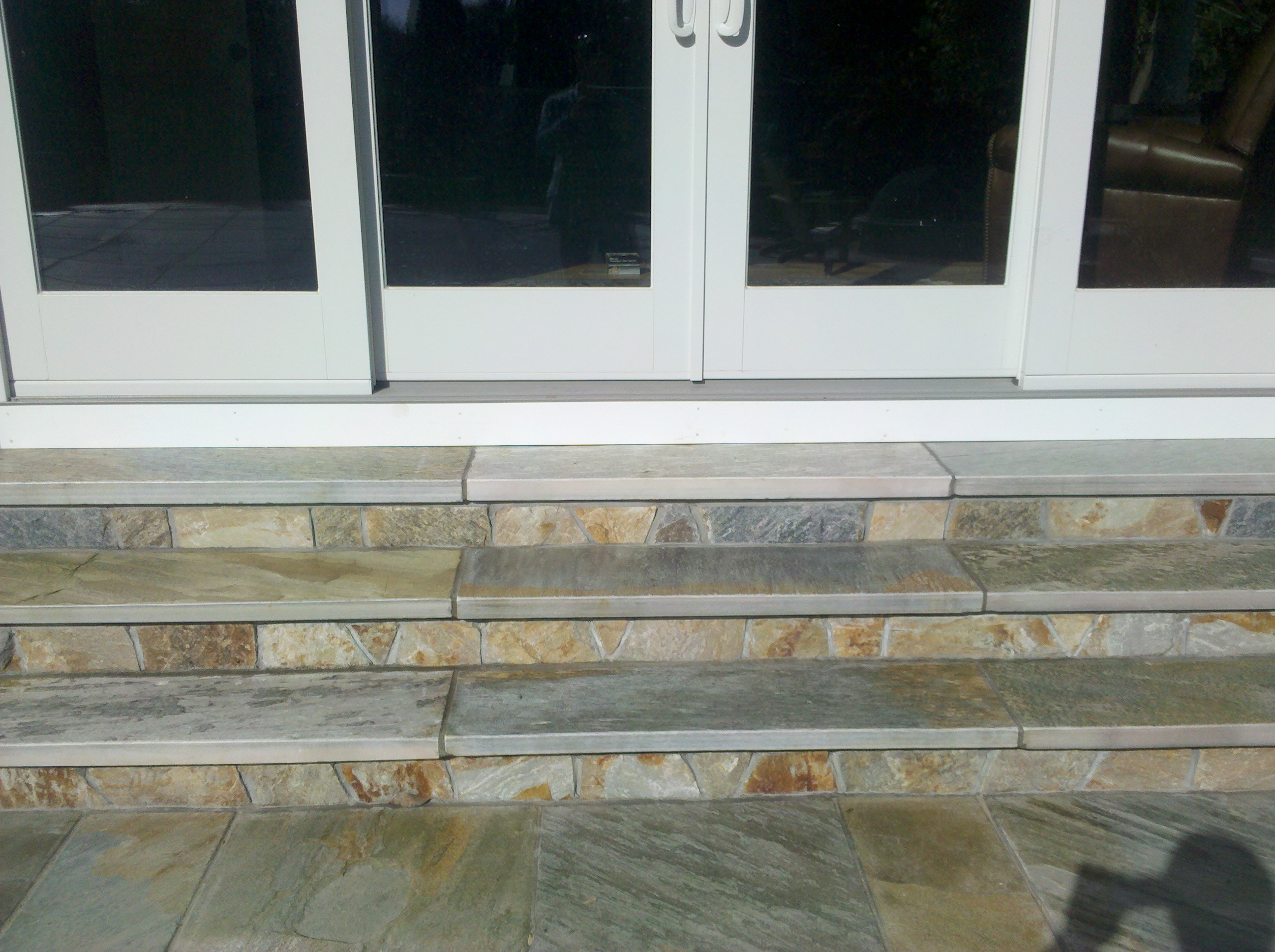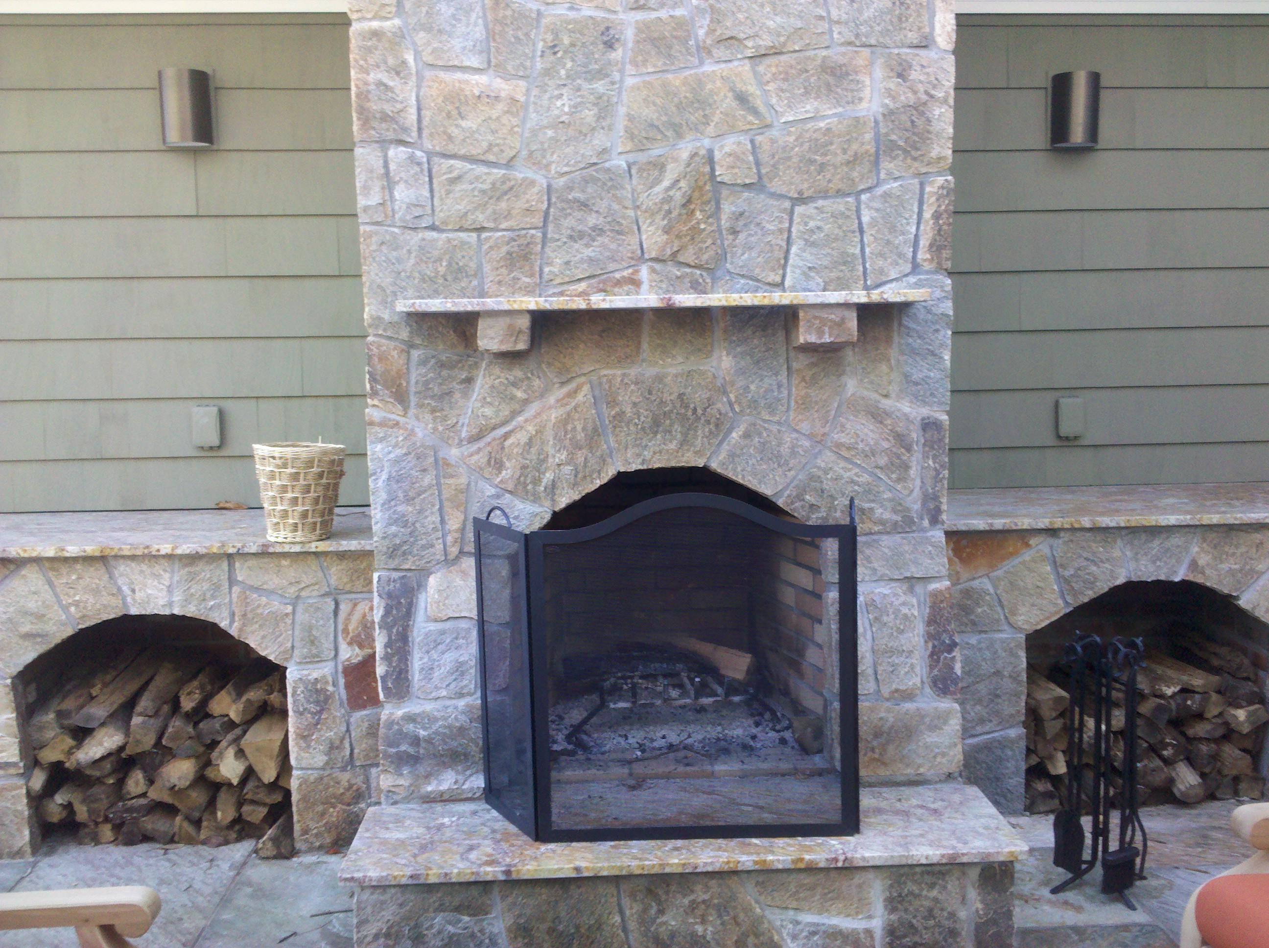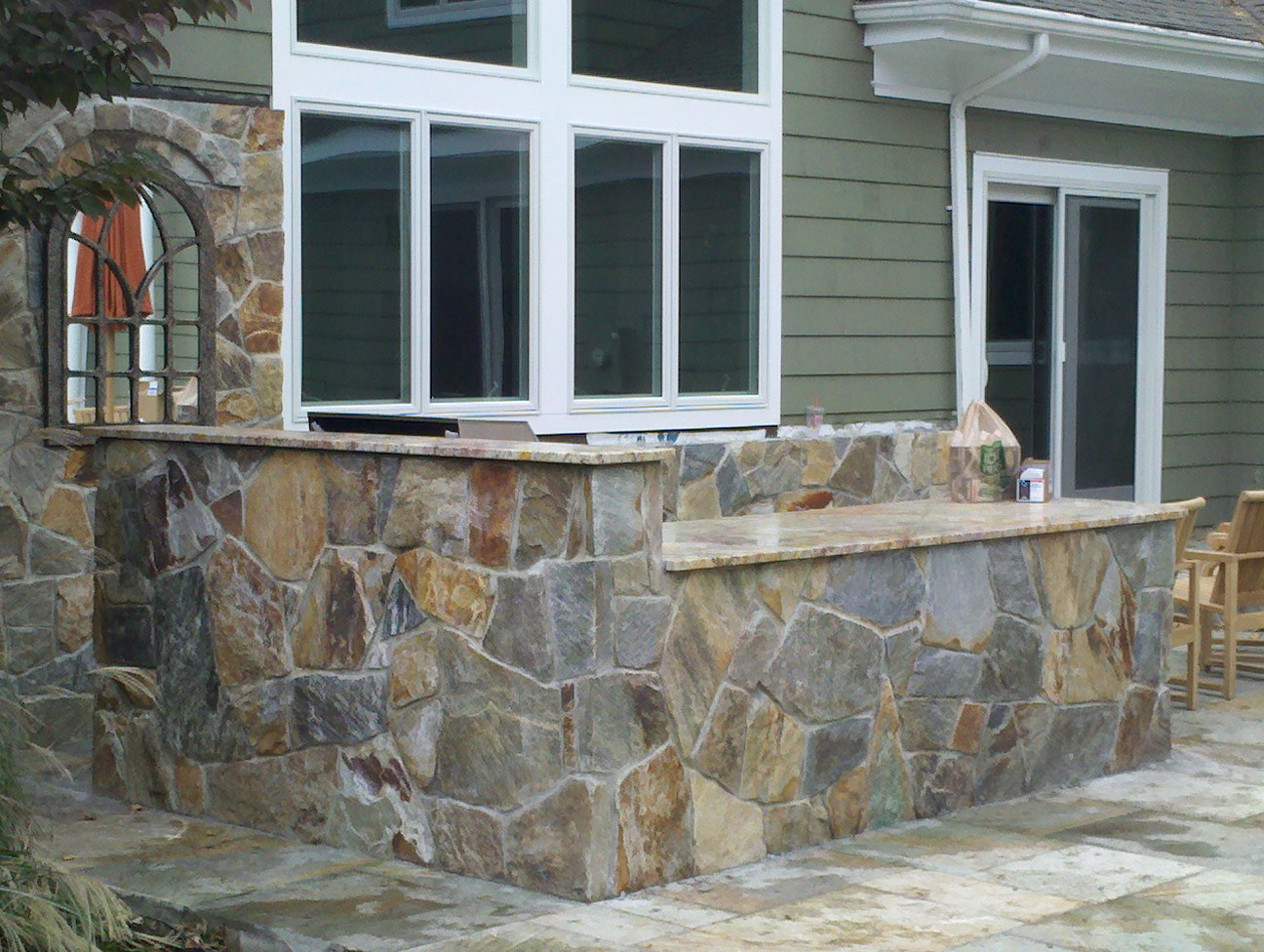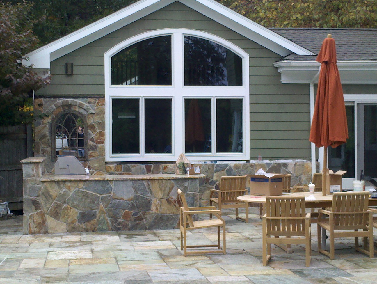 Preferred Properties principal outdoor living designer and outdoor kitchen builder extends his vision well beyond the walls of this Westport Connecticut residence. With over 26 yrs as a landscape designer and masonry specialist, Michael Gotowala’s design build team at PREFERRED PROPERTIES LSC, Inc has been consistently exceeding customer expectations on artistic vision, masonry excellence and overall wow factor in outdoor living. This outdoor living project features an outdoor fireplace with curved stone bins, flanked by an outdoor stainless steel audio storage cabinet and refrigerator topped of with leatherette slabs. Certain details standout as in the queen Anne’s slanted stone legs holstering the outdoor fireplace. Spectacular stone and Norwegian buff random patterned decking upholds the Patio, terrace, spa area, pool patio and outdoor kitchen area. Color ranges from iron, gold to green. Surrounding courtyard walls lead up to the swim up spa. On the other end of the spectrum is a sprawling outdoor kitchen and gathering area by the stone firepit.