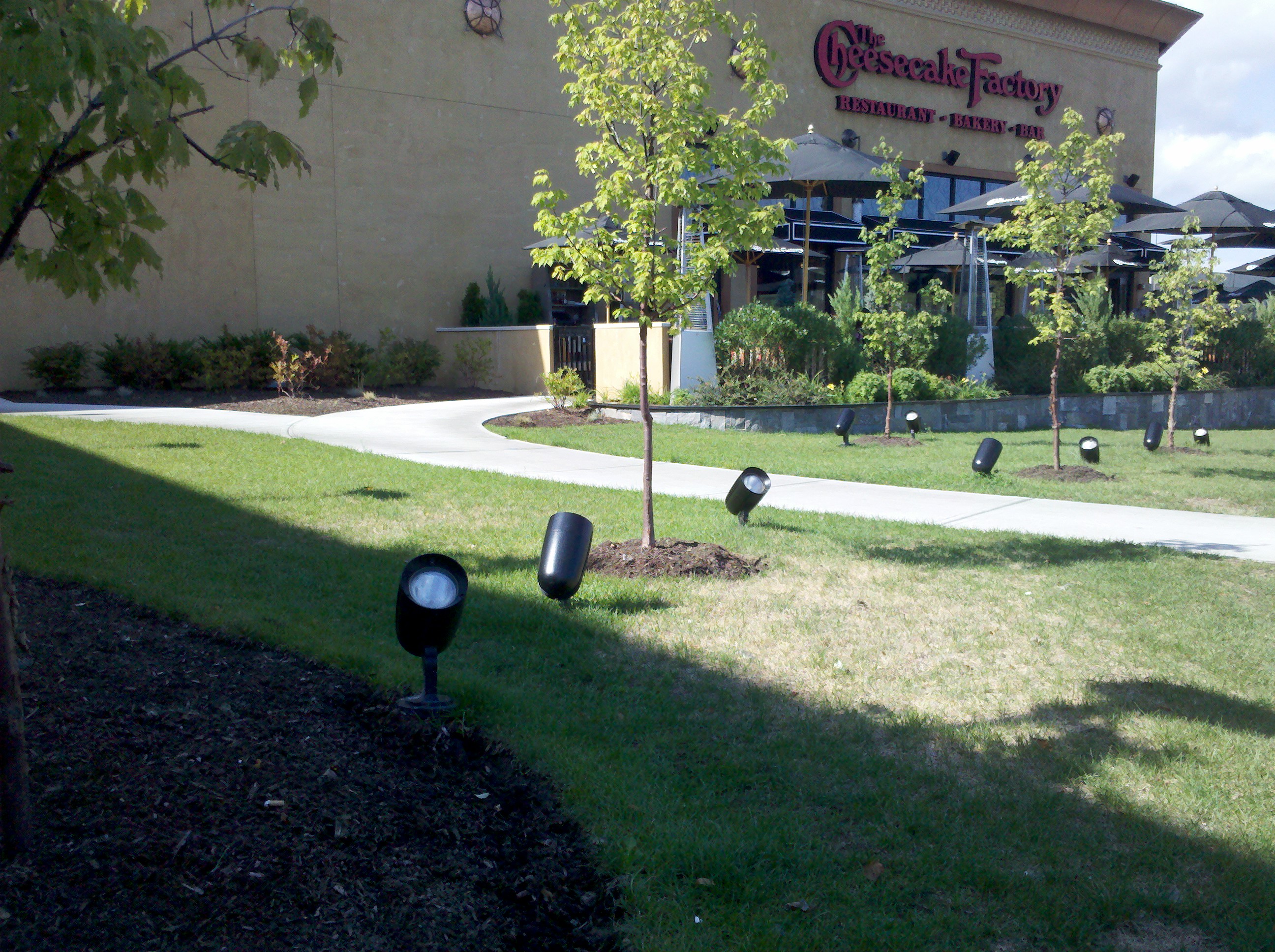 Currently I am spending much of my career designing and lighting landscapes, and have come to the conclusion that I am much more aware of lighting and its space that light creates. I am on the verge of constantly envisioning the night time scene as I walk amongst the landscape whether it be urban, commercial or residential. With the influx of LED lights gathering populartiy due to its energy efficiency, and longevity in the Landscape. Our tool box is over filling with fixtures of every type, various color temps and a range of beam sprays. The key to a successful night lighting scene is to understand what you are lighting, type of textures reflecting and the message of illumination. Its obvious that a great deal of the outdoor lighting fixtures are hidden amongst, pointed at, and supported in the Landscape. This being said the more you understand about the Landscape and its plant types and how light will interact off such plant textures throughout the seasons both day and night. Its this vision during the day which allows you to envision placement of lighting sources to create this night time drama. This award winnning vision and passion for achieving great lighting scenes is what separates the Professional outdoor lighting designer versus the lighting contractor. I could not believe my eyes when I apporached the mall with my better half for a little retail therapy. The grounds of this particular mall were nicely landscaped and well kept. What I found when it came to the lighting was upsetting. Look at this picture closely.