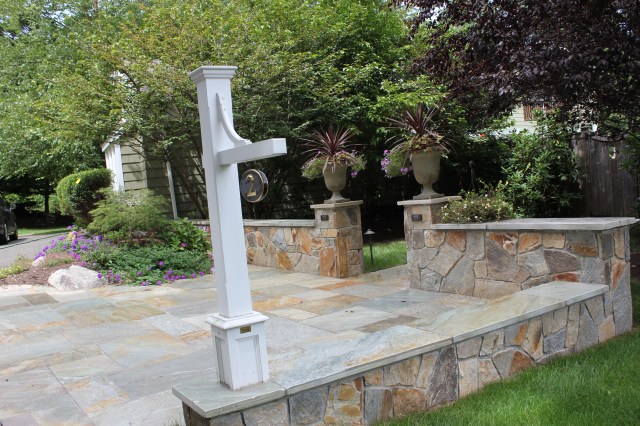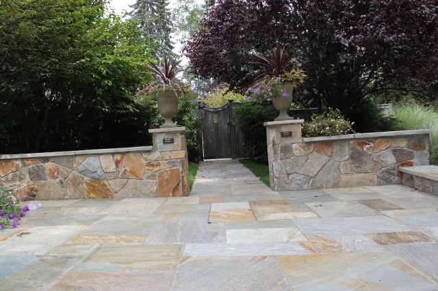 Residential landscape designer excells in use of stone masonary to highlight this Westport residence