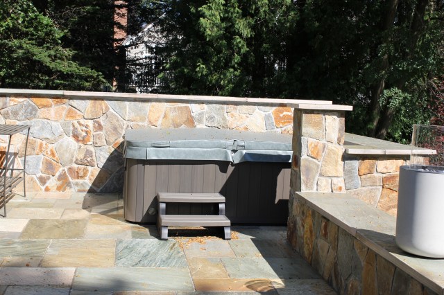 Look at the far end of the Stone patio as it harbors a stone spa built into privacy wall with fire Jars.