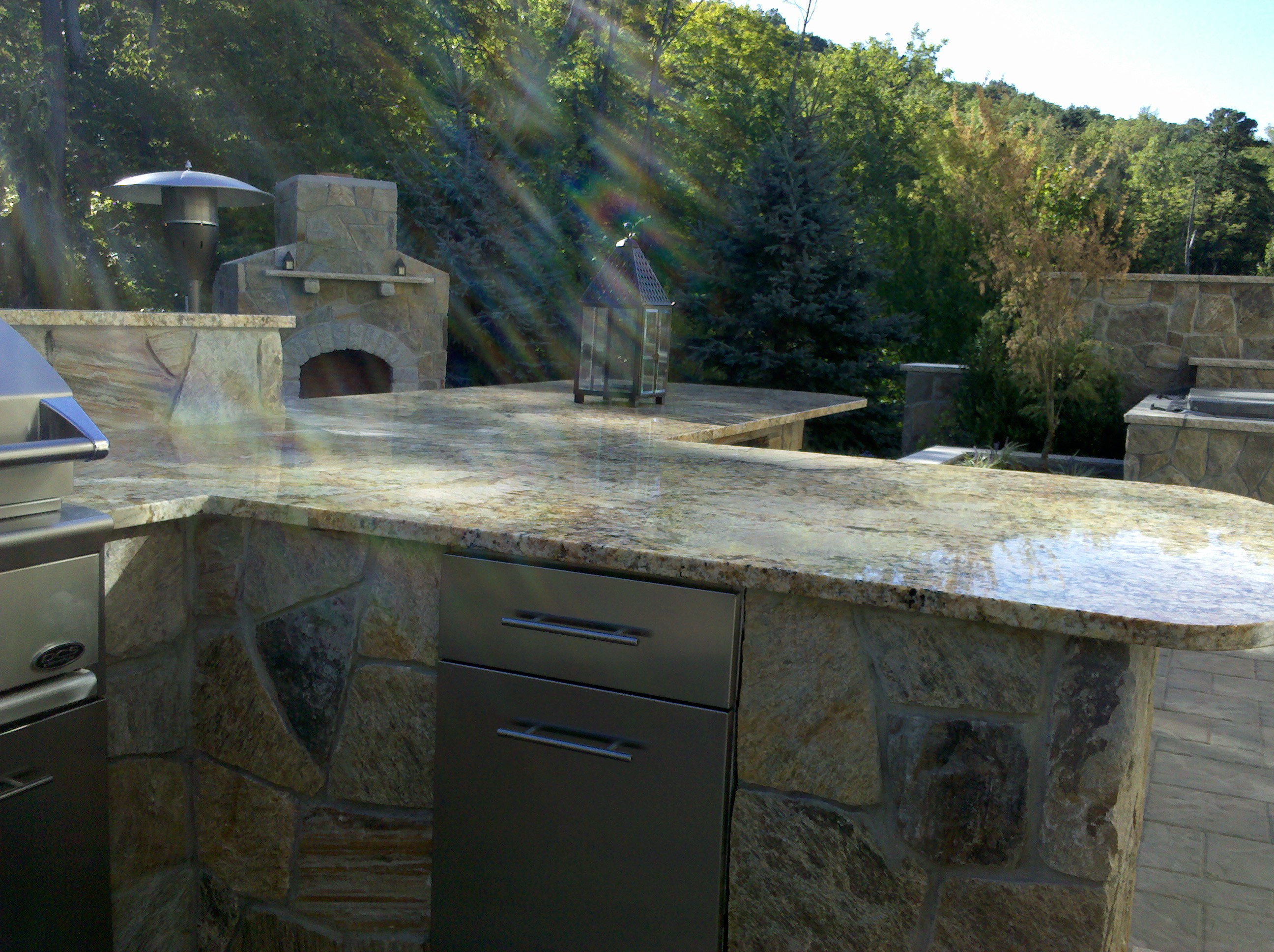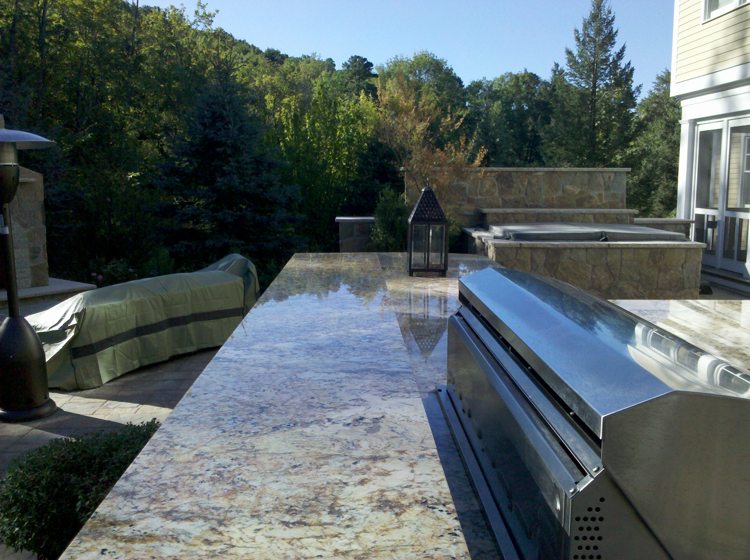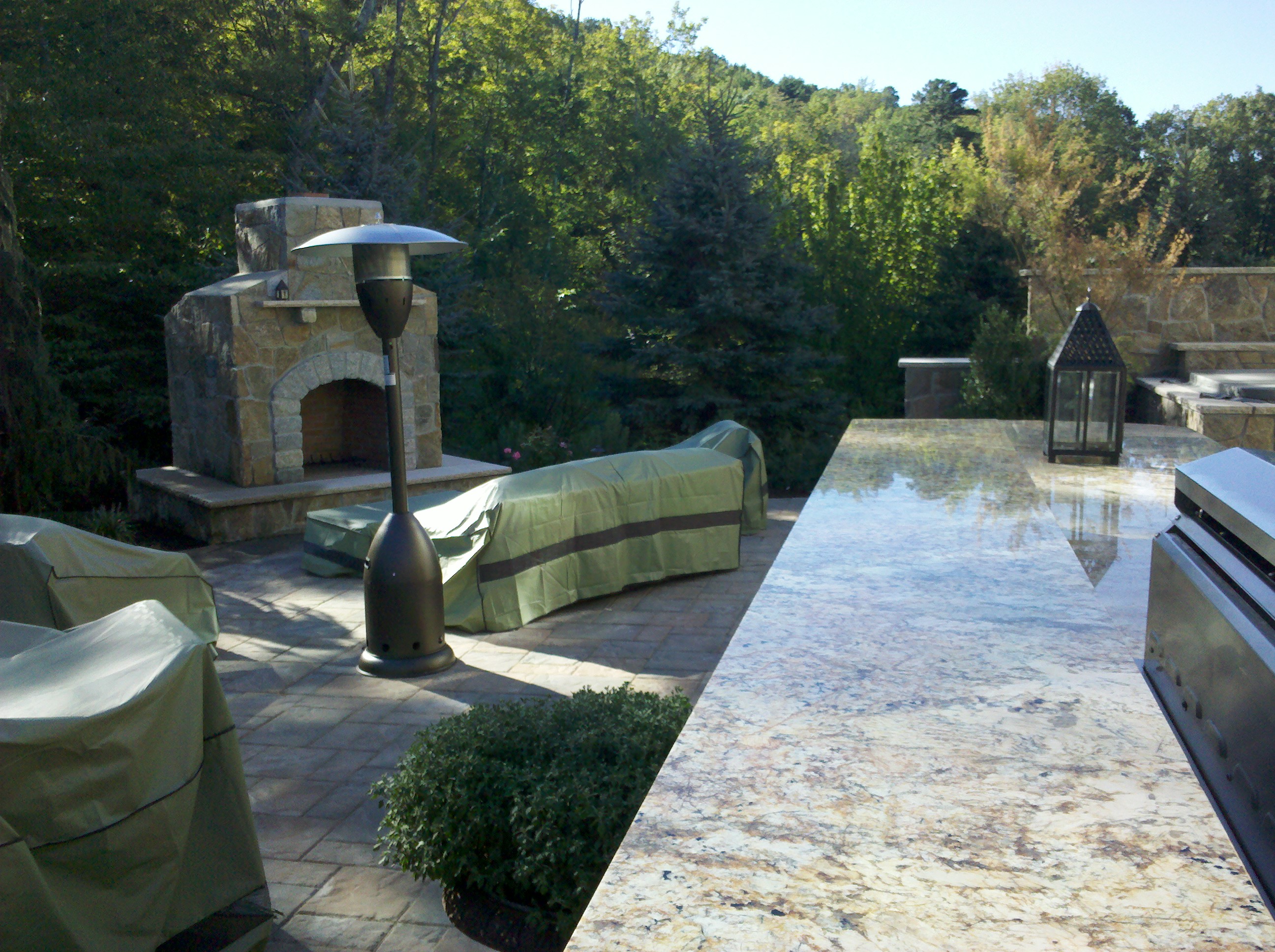 This outdoor living space featured here has a covered space for after dinner converstaion. A custom built wood fired fireplace with Wood stack built inside the back of it for ease of fire buiding. The focal and centered outdoors is a magnificent outdoor stone grill island in a TEE shape with cooking located on one side central to the indoor kitchen. the right side of the island TEE houses bar stools and wine cooler with refrigerator for wine tasting and fire viewing. Just right of the outdoor kitchen island on the end of the patio is a hot tub built into a privacey wall amongst fire jars and landscaping nicely lit at night for great entertaining and emotion.
