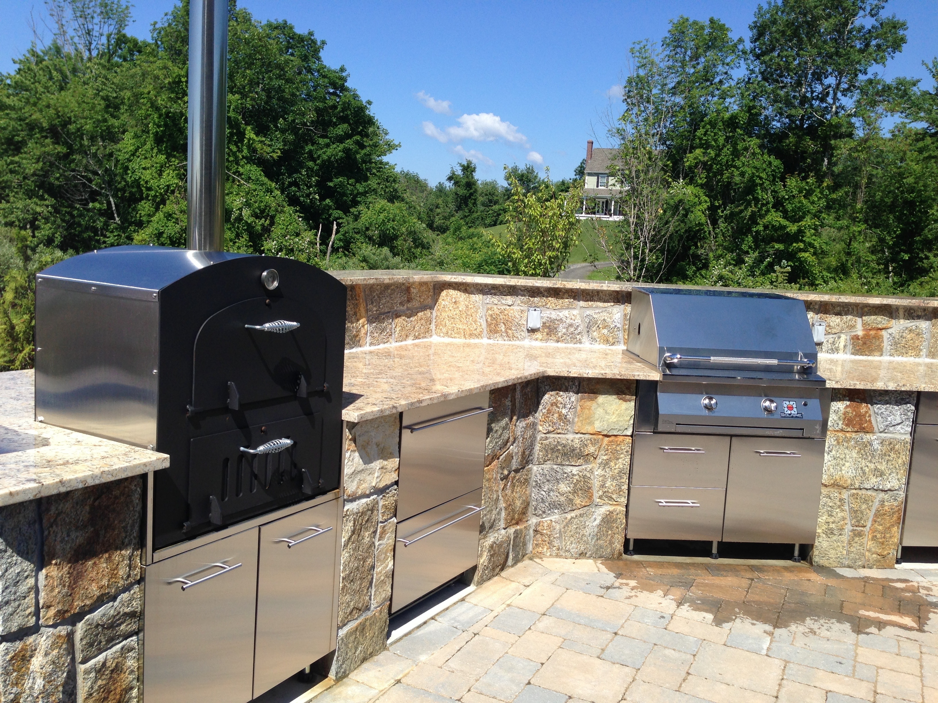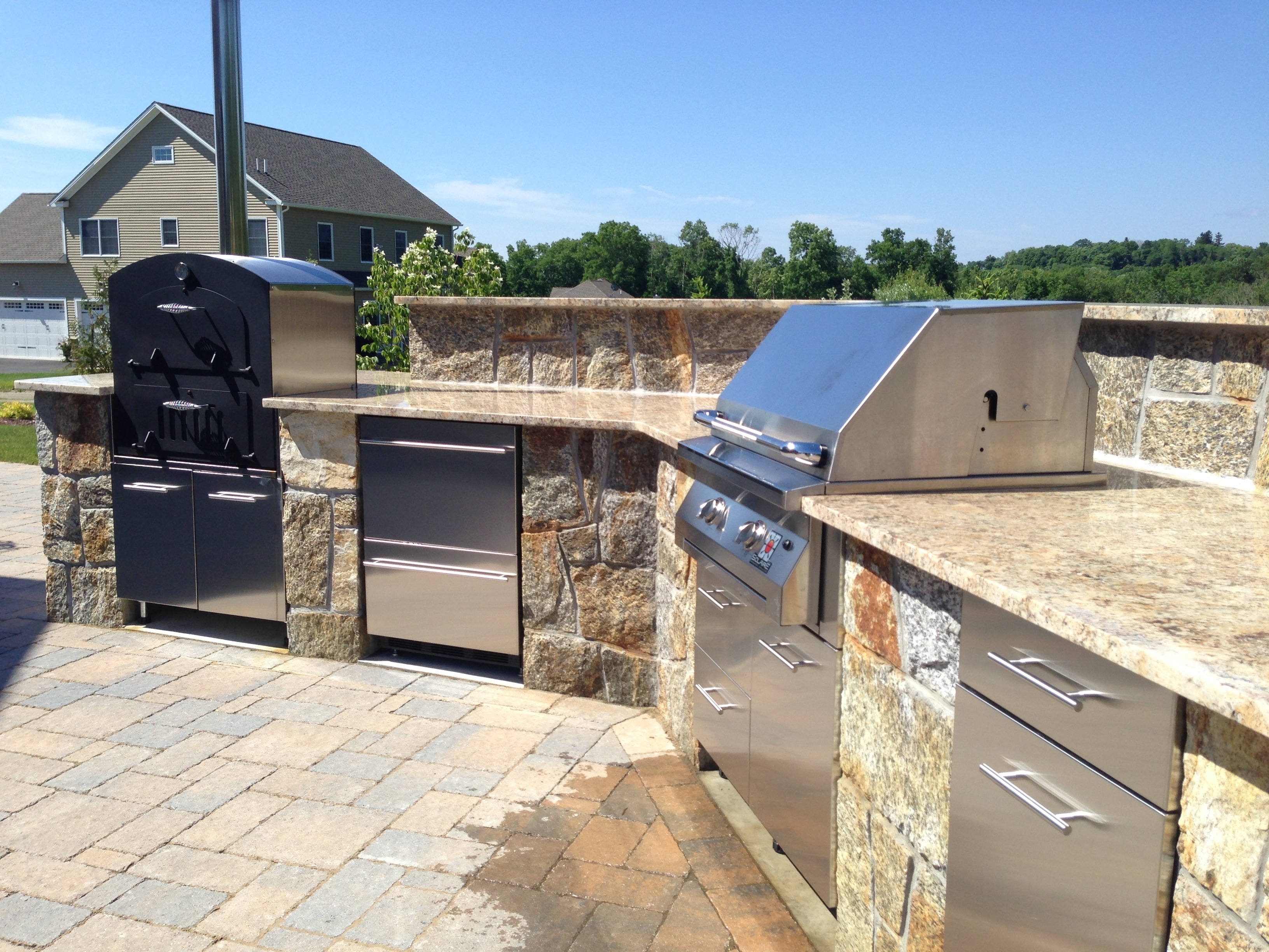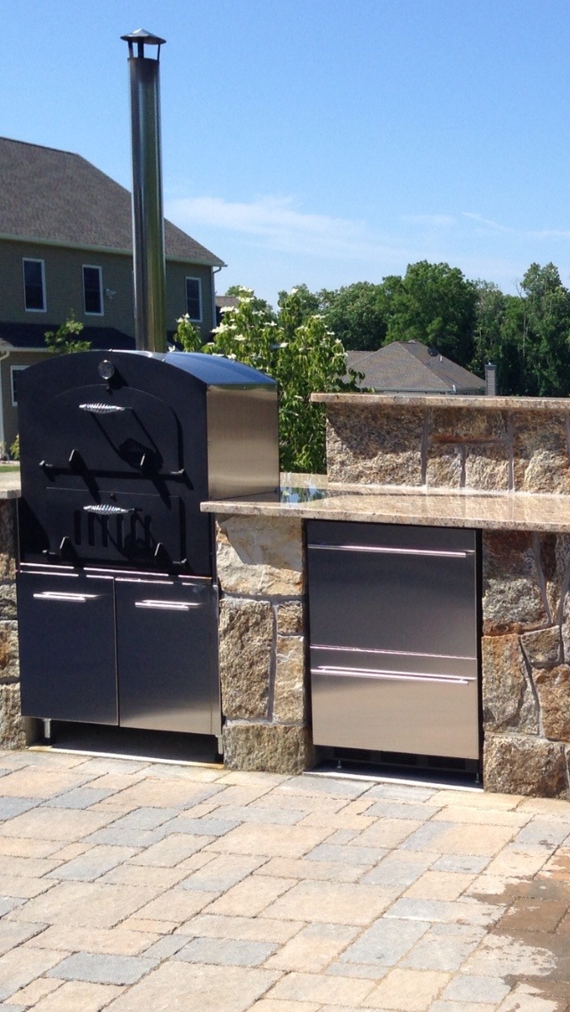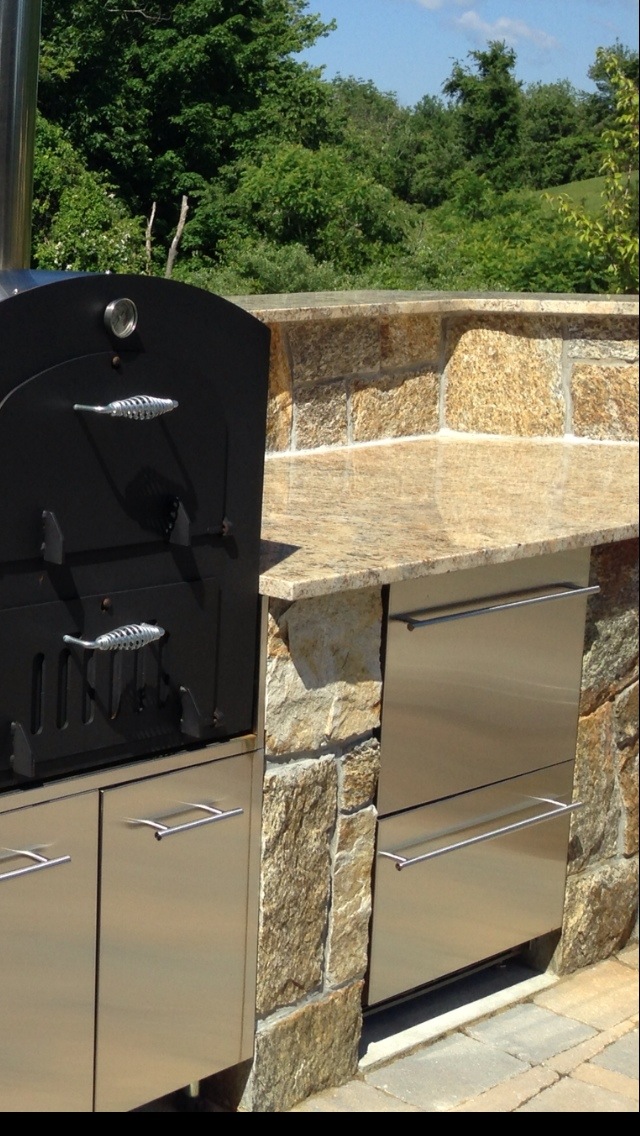 Expanded outdoor kitchen island hosting unique outdoor pizza oven, outdoor grill, danver trash pull and summitt two drawer refrigerator with stone and granite counters.