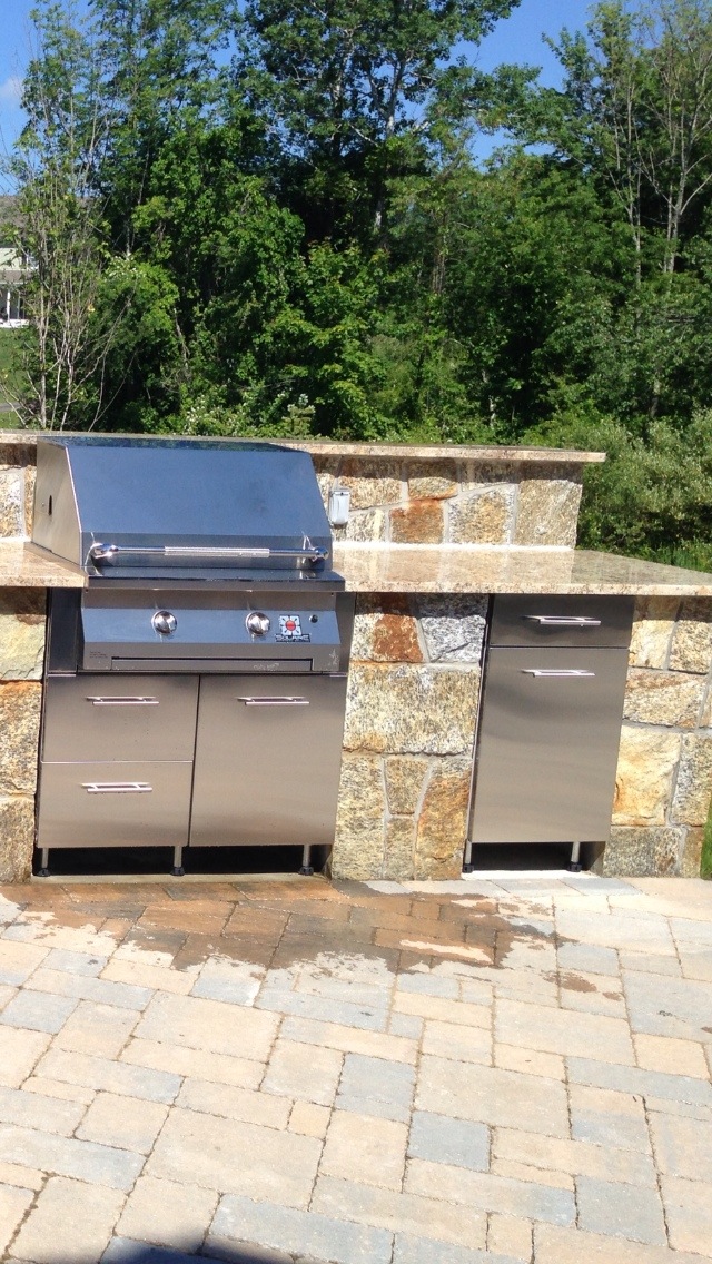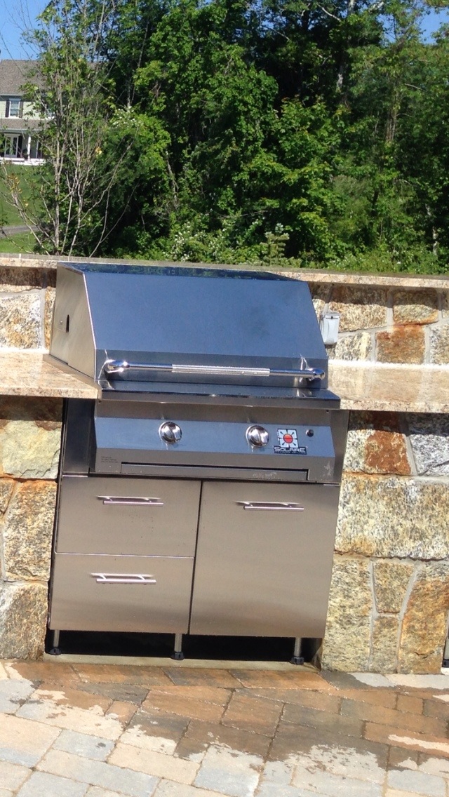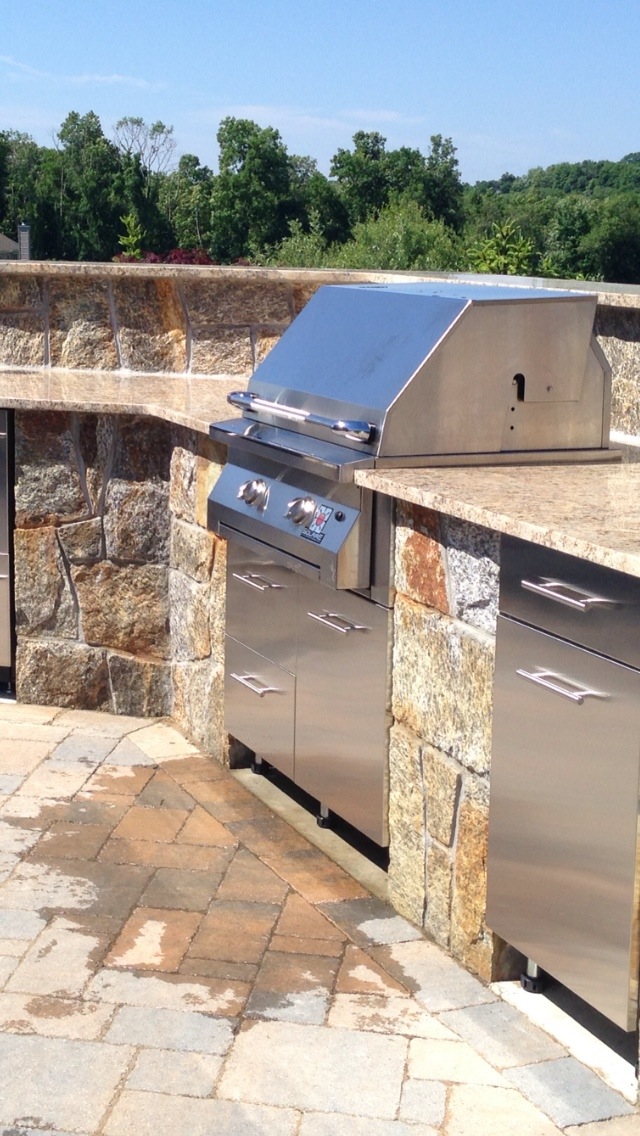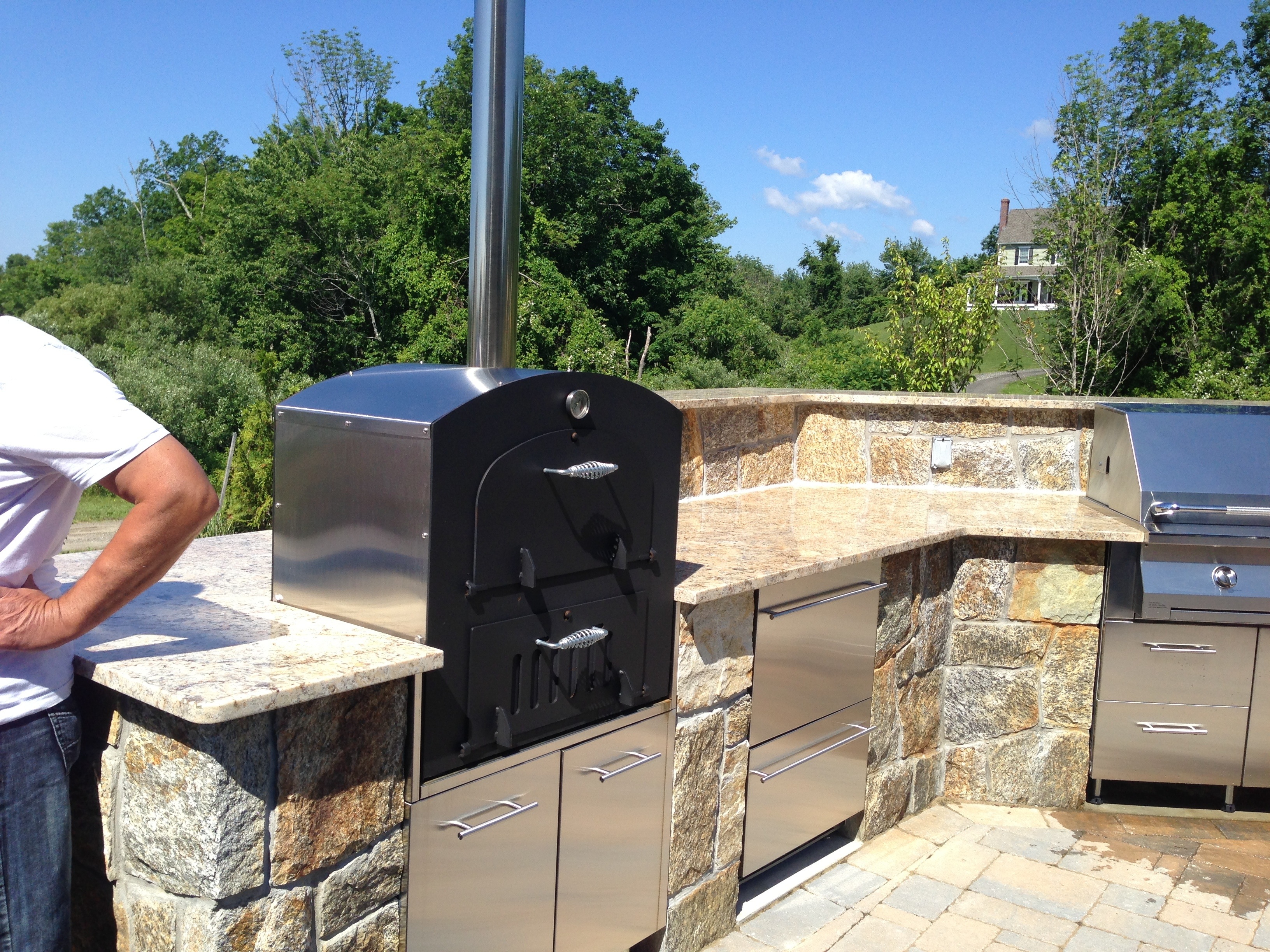 Expanded outdoor kitchen island hosting unique outdoor pizza oven, outdoor grill, danver trash pull and summitt two drawer refrigerator with stone and granite counters.