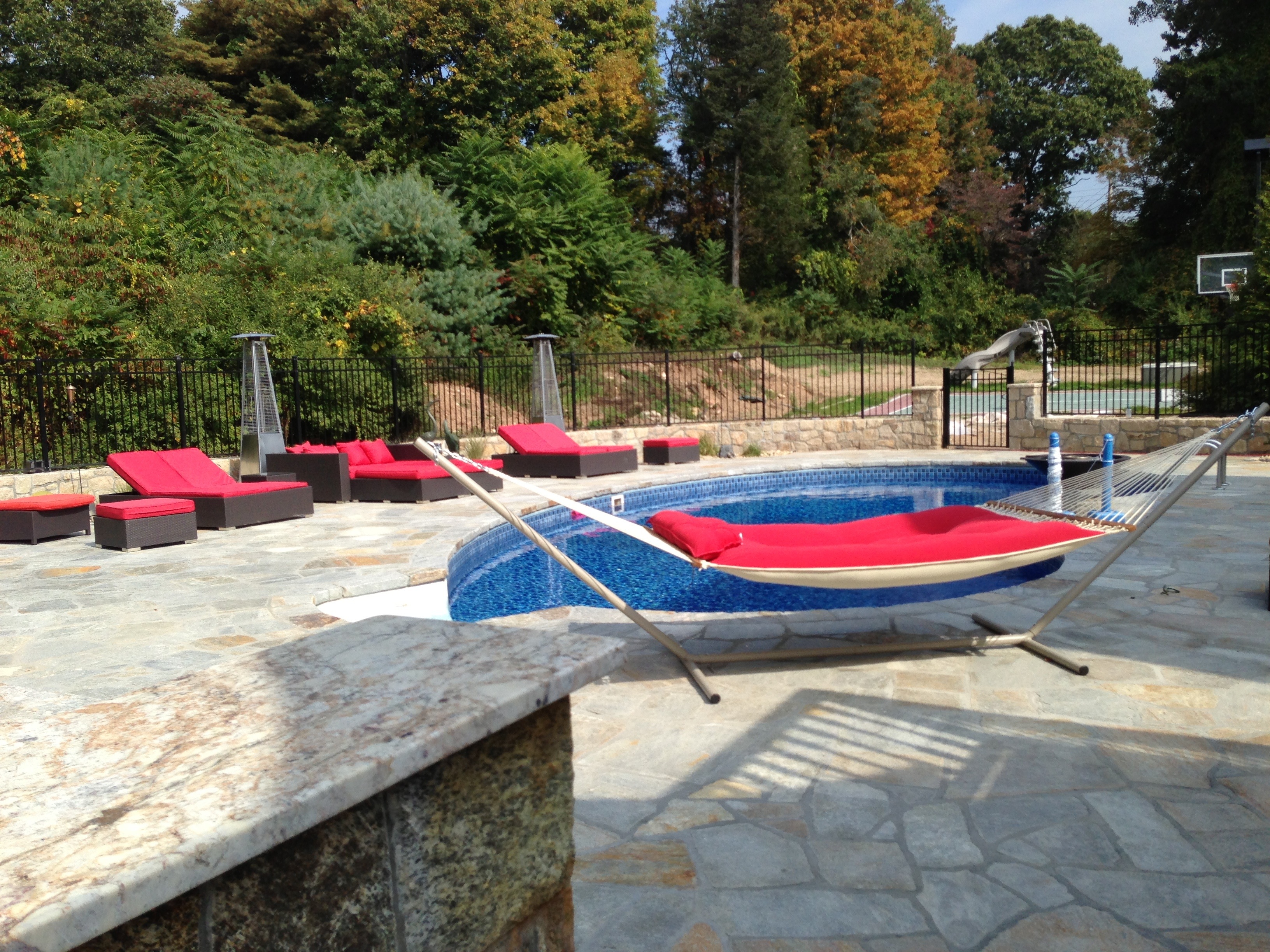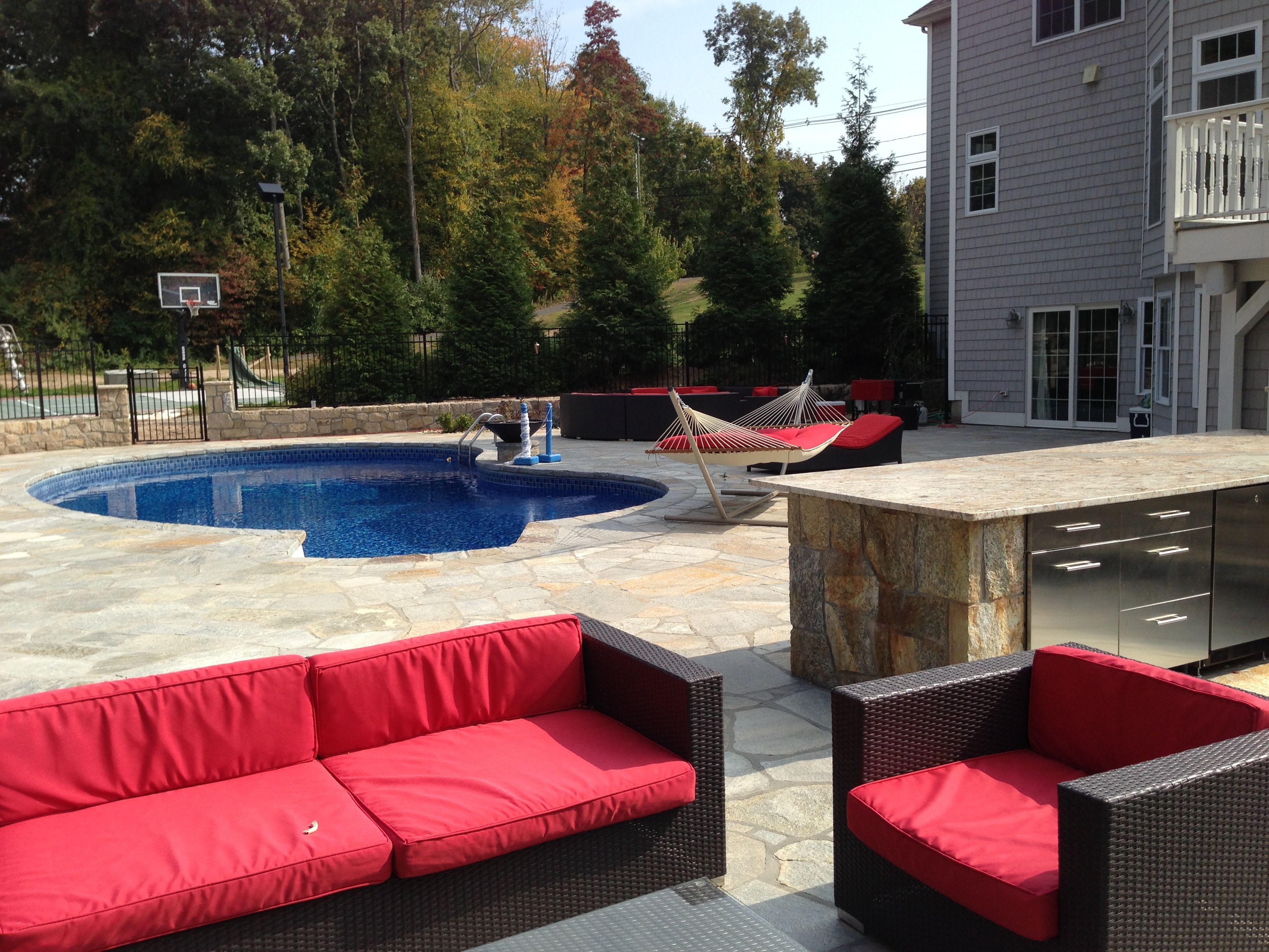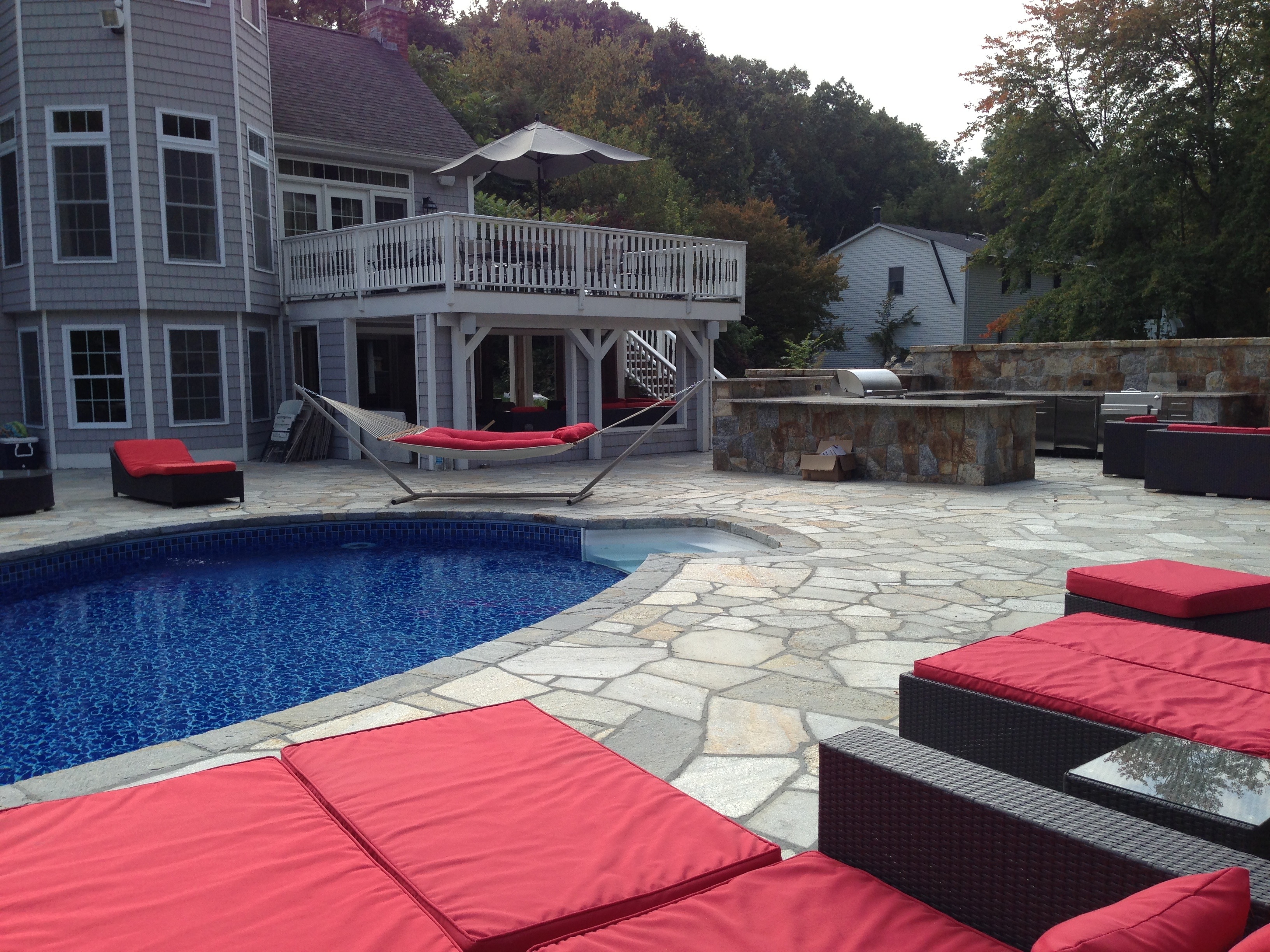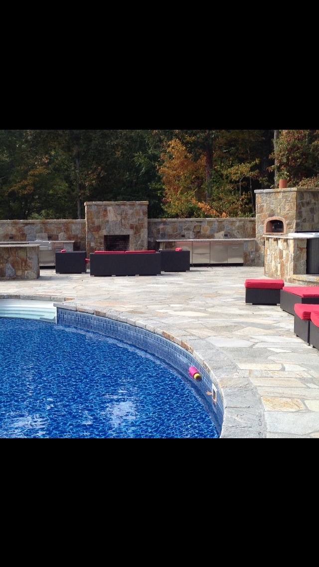 Large stone patio and towering stone wall surround completes this poolscape Of this Connecticut residence.