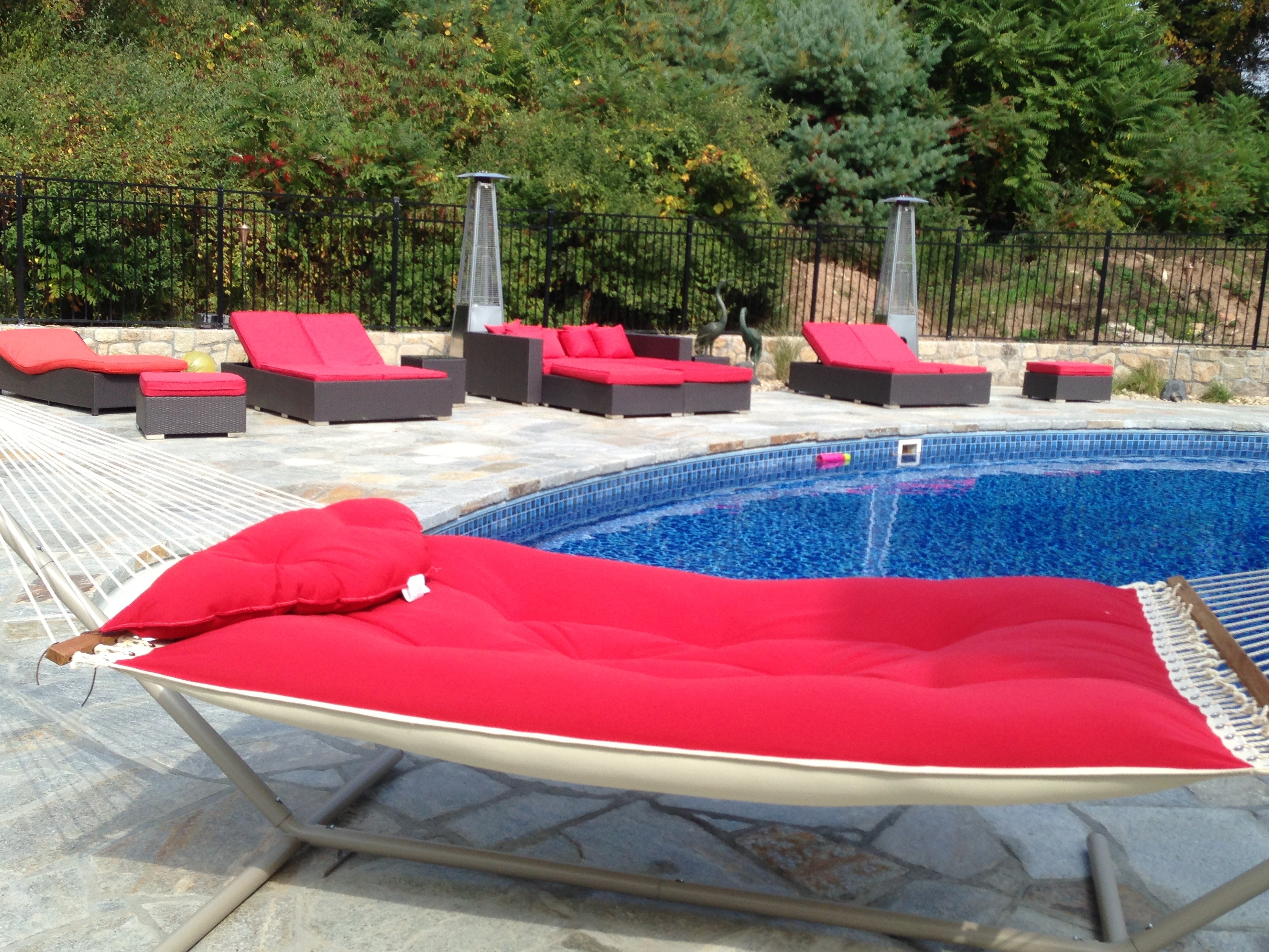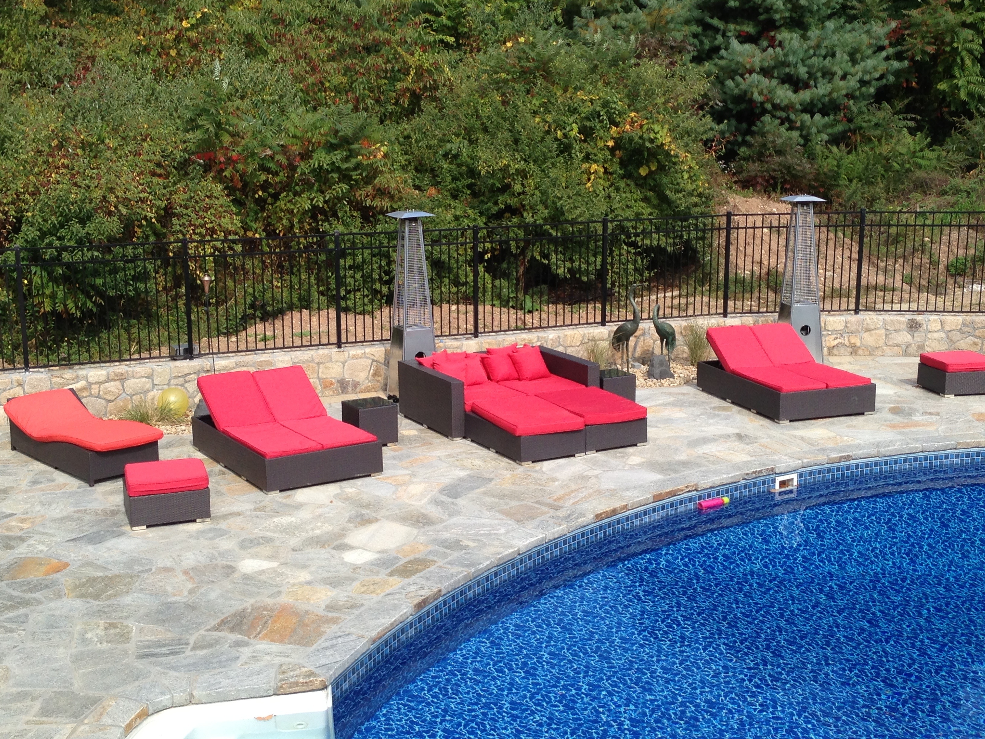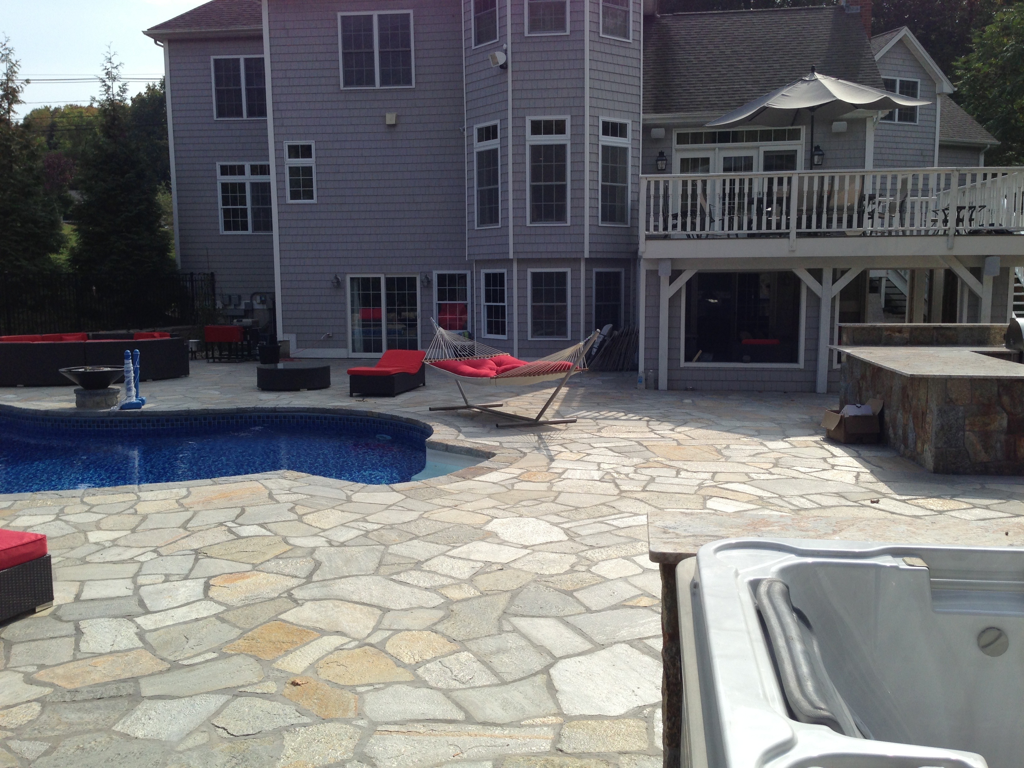 Large stone patio and towering stone wall surround completes this poolscape Of this Connecticut residence.
