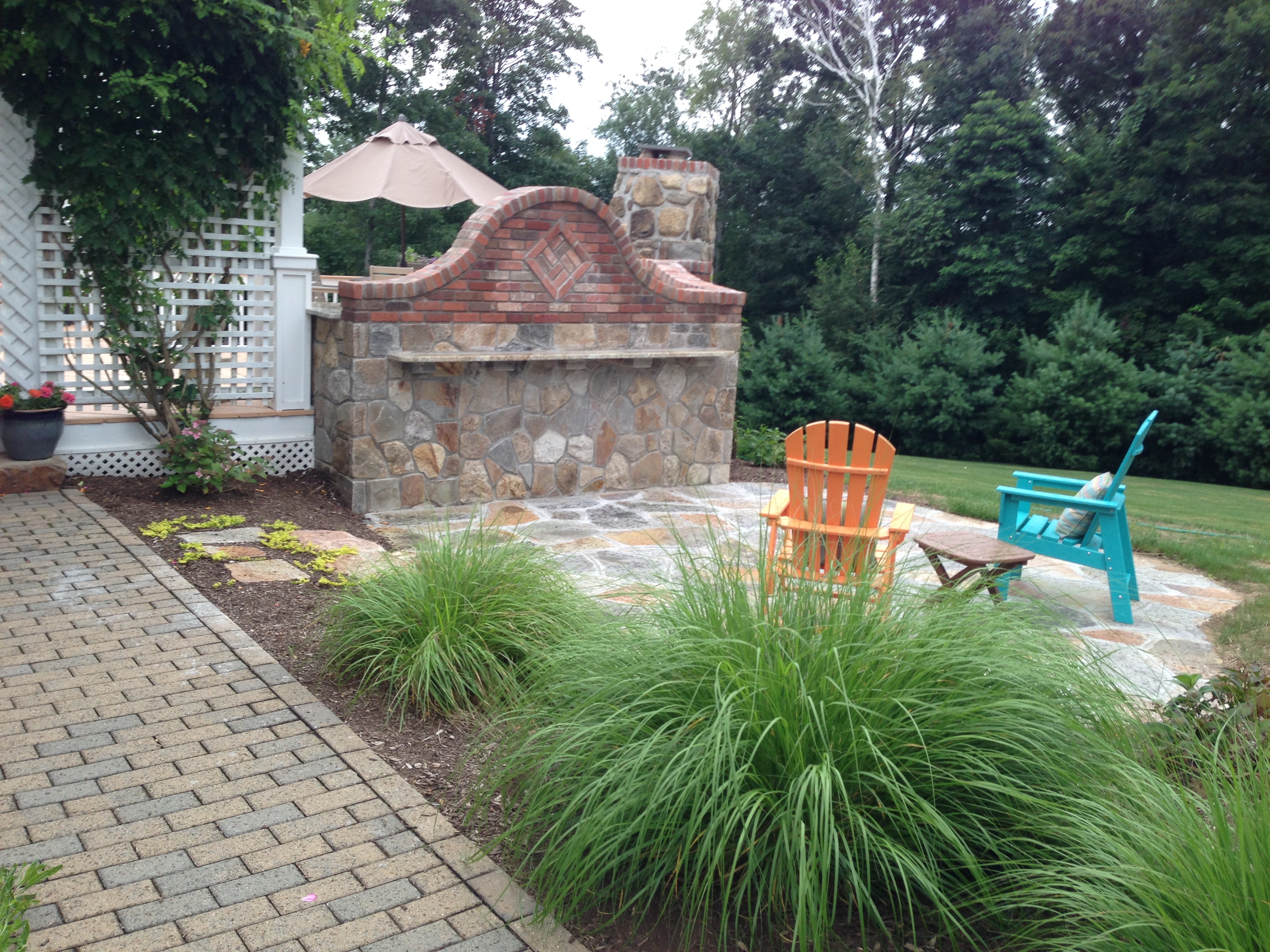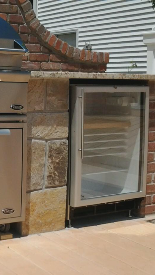 Living Fabulously outdoor kitchen designer shows us the beauty in meshing Brick and stone into this Outdoor grill island to match the pre existing homeowner built fireplace. A simple remedy was to put a band of brick on top of the existing fireplace and use the same brick and stone to accent the stone on the house to blend the textures of each while building the grill island along the fireplace. The eye catching focal is the brick backsplash that acts as a wind break and on the backside works with the sun catchers stone patio.