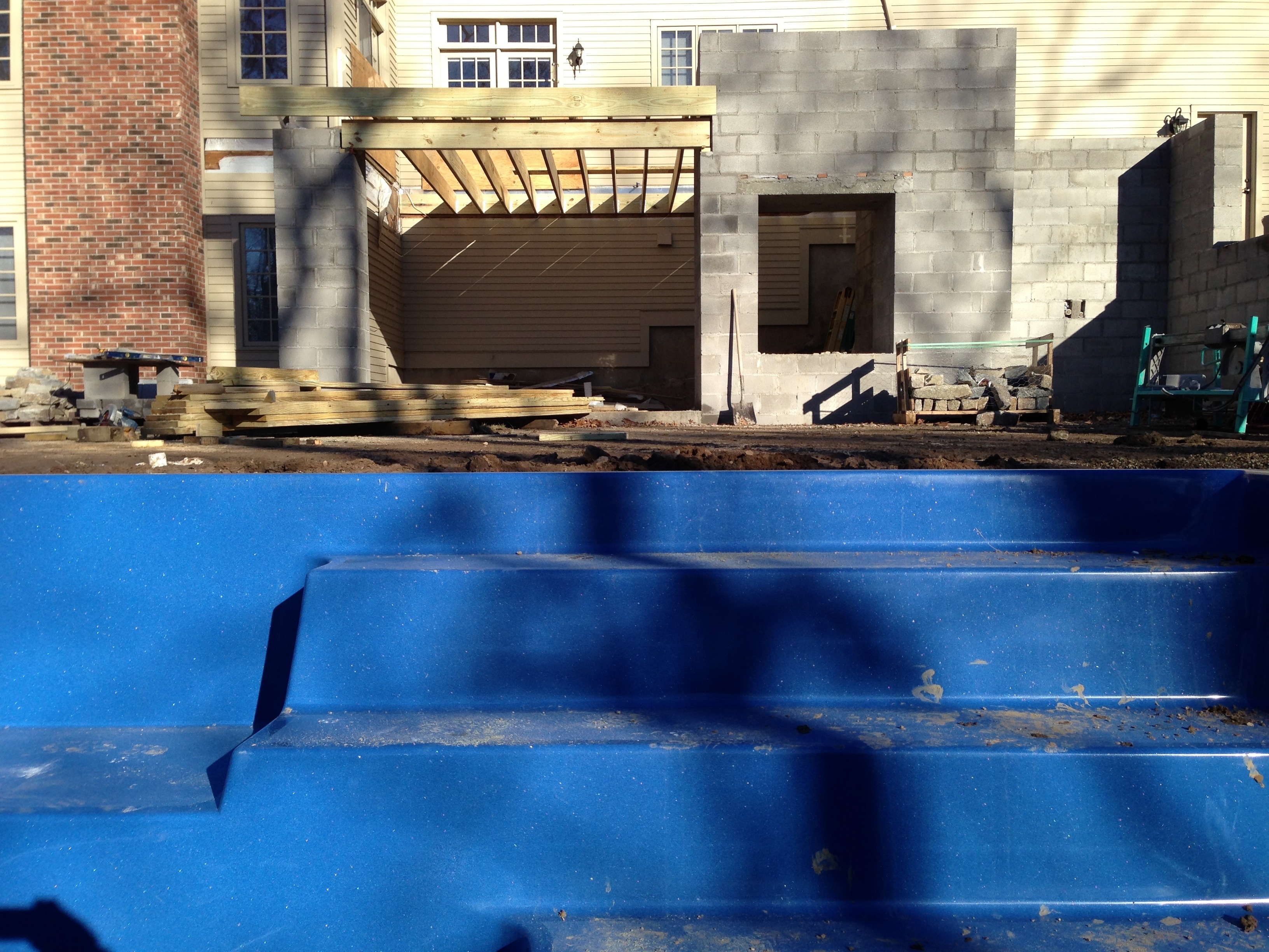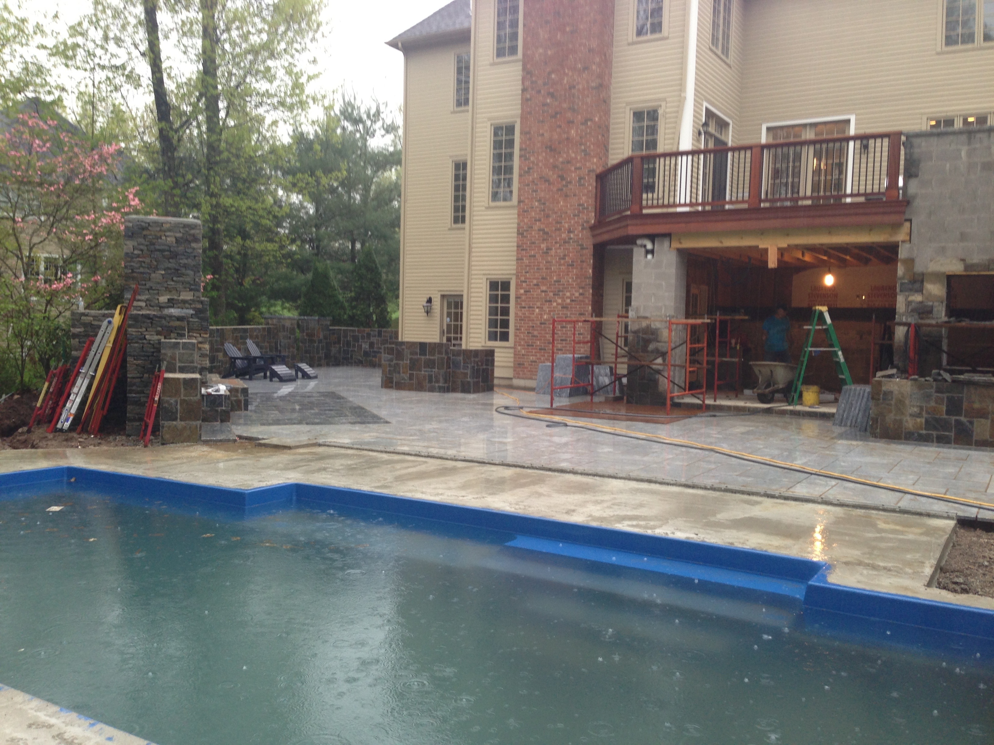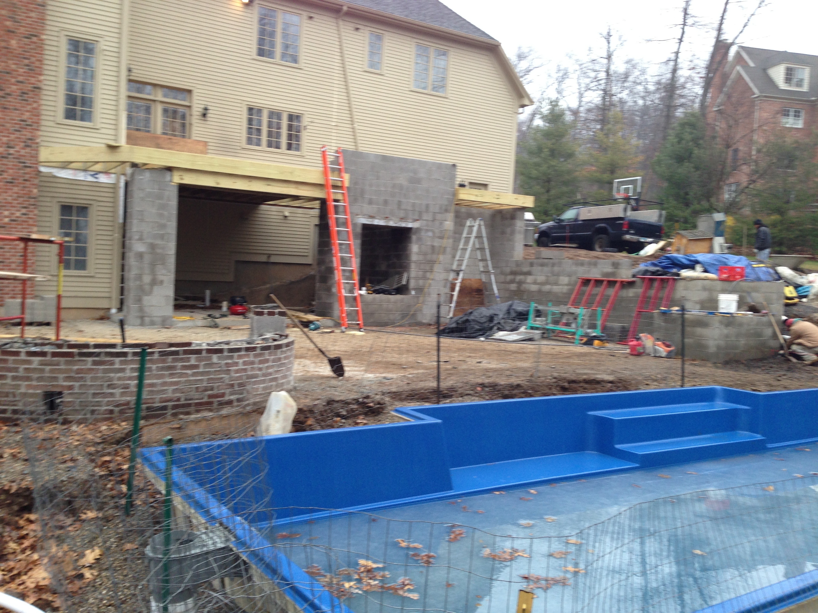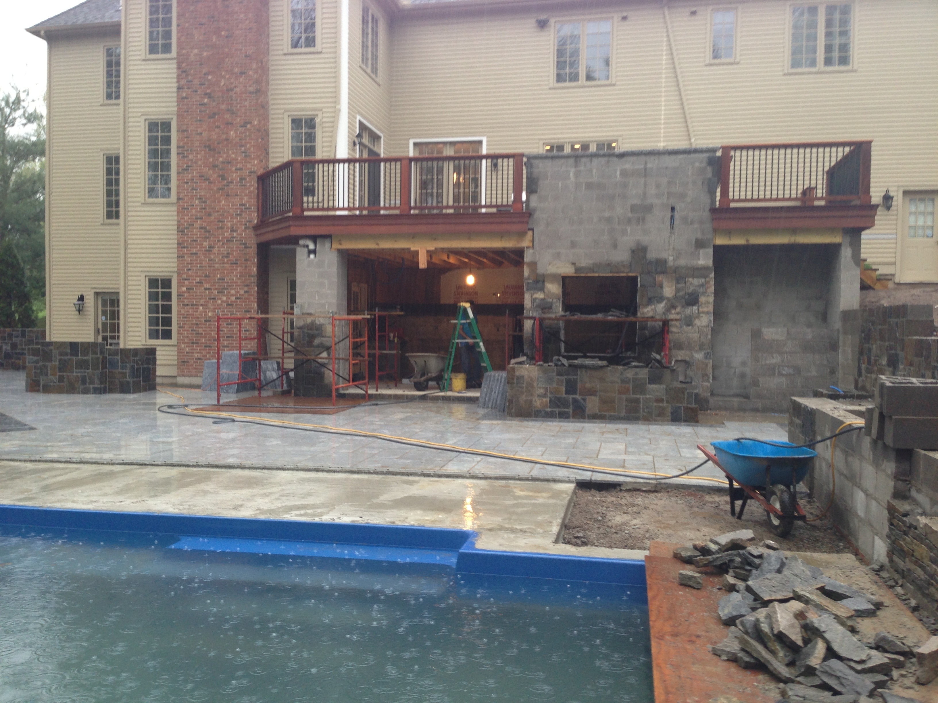As the enthusiasm built interim the initial construction of phase I. It didnt take long to implement phase II. A Fiberglass pool setting to anchor the end of the marble patio. So in addition to the upper level stone grill island, expanded layout of mahogany del to wrap around the towering stone. There is an outdoor hot tub abutting the lower stone tower with pass thru window into the outdoor great room underneath the weather proof Mahogany DECK above.