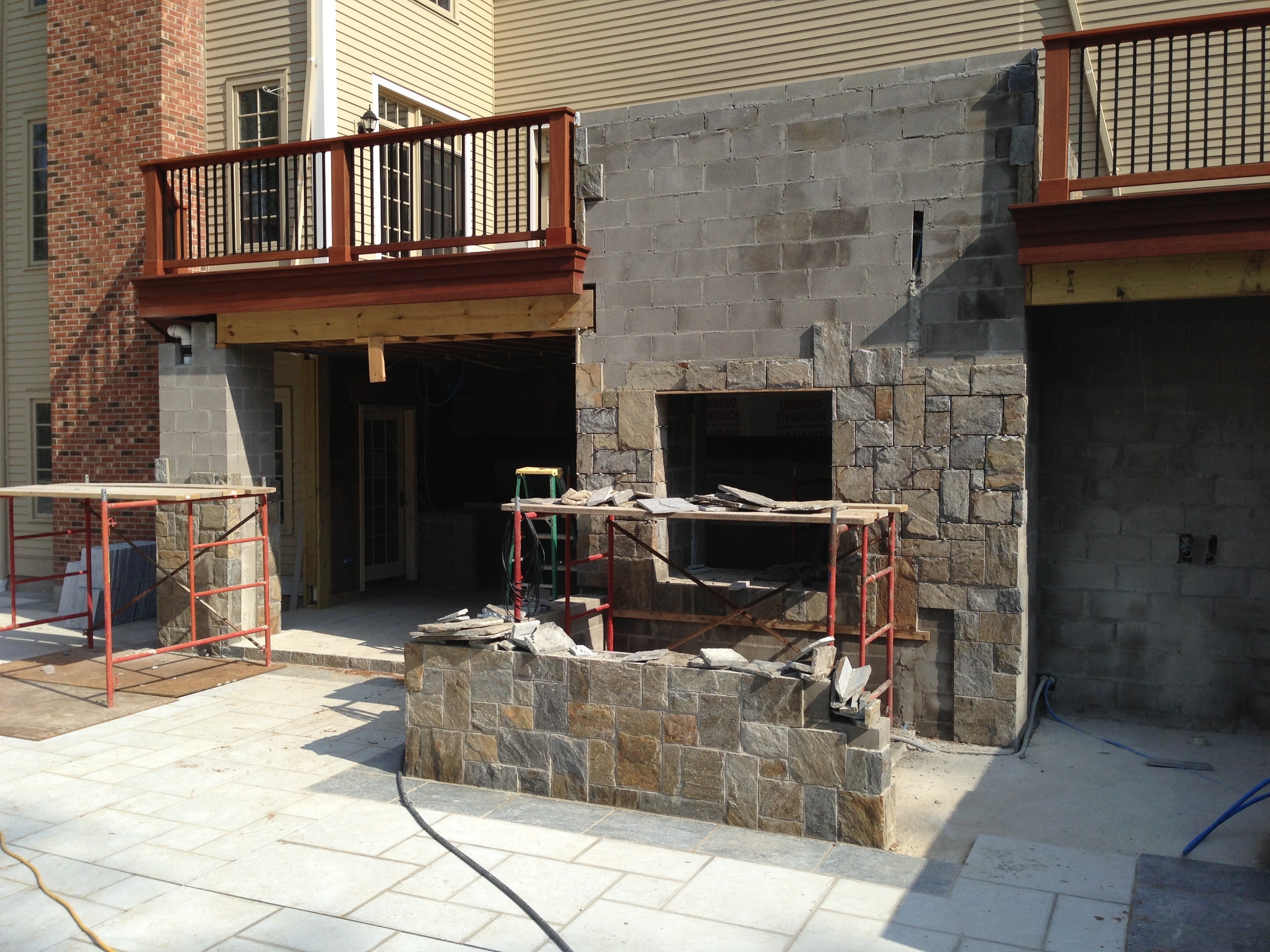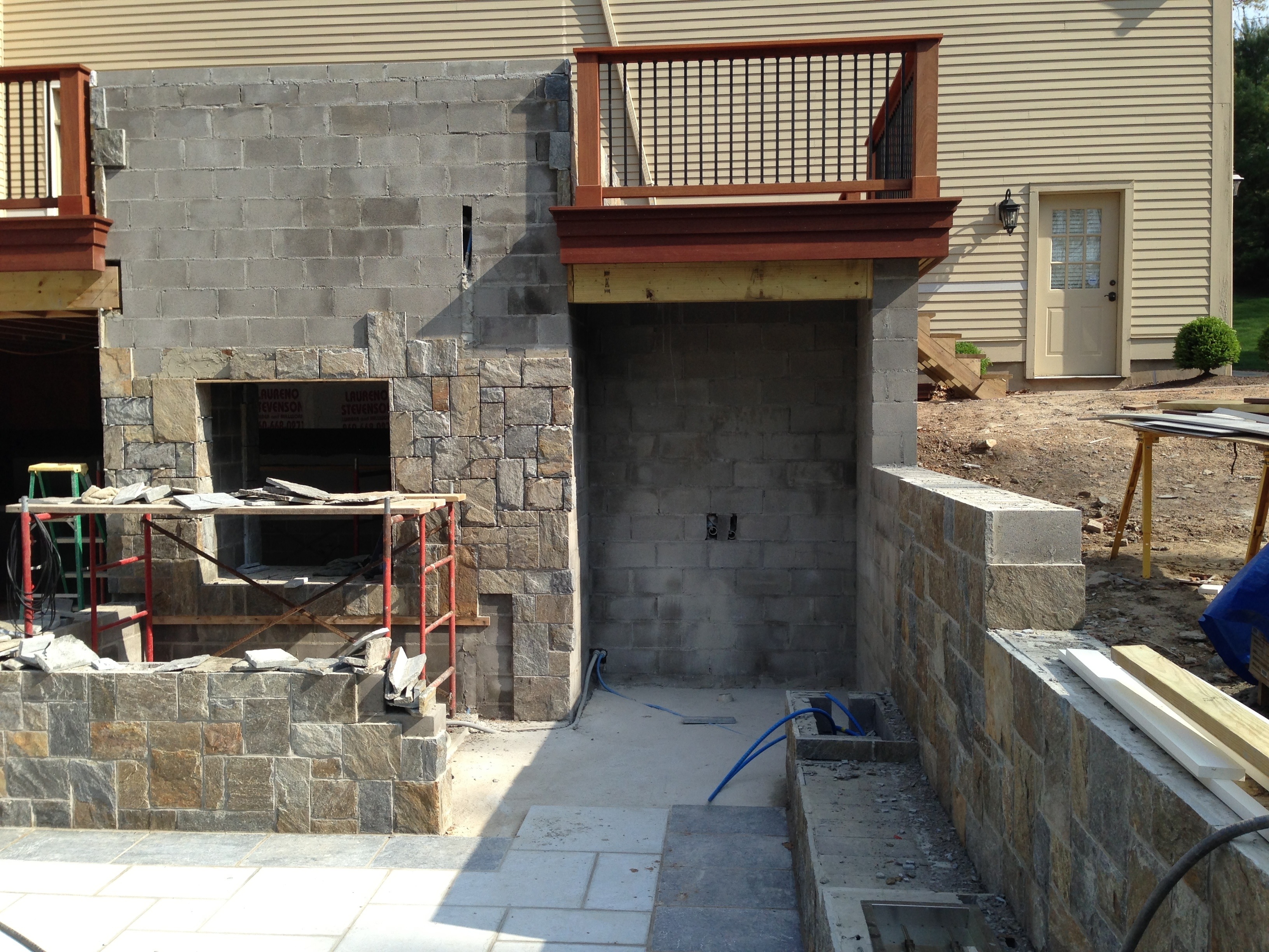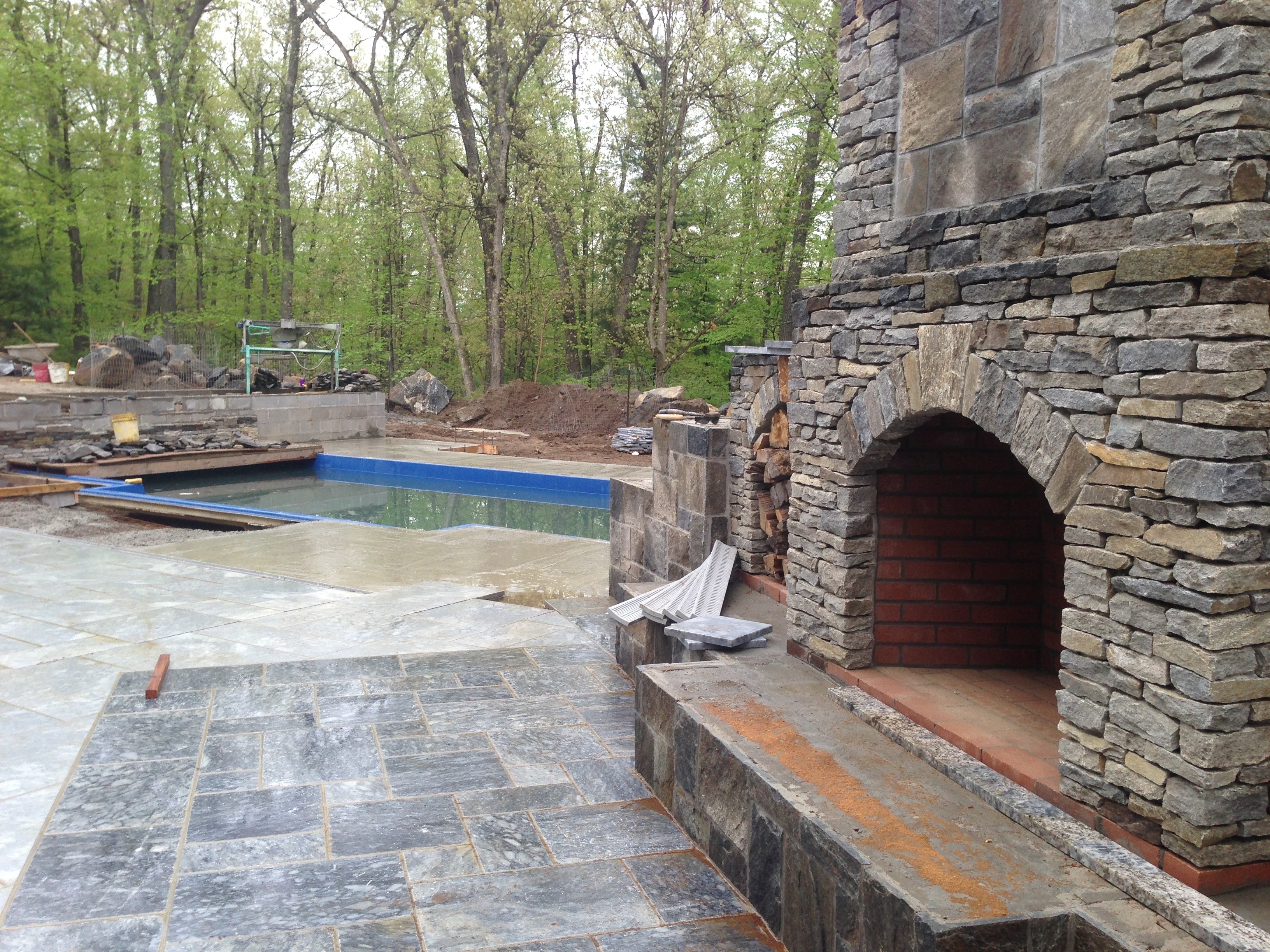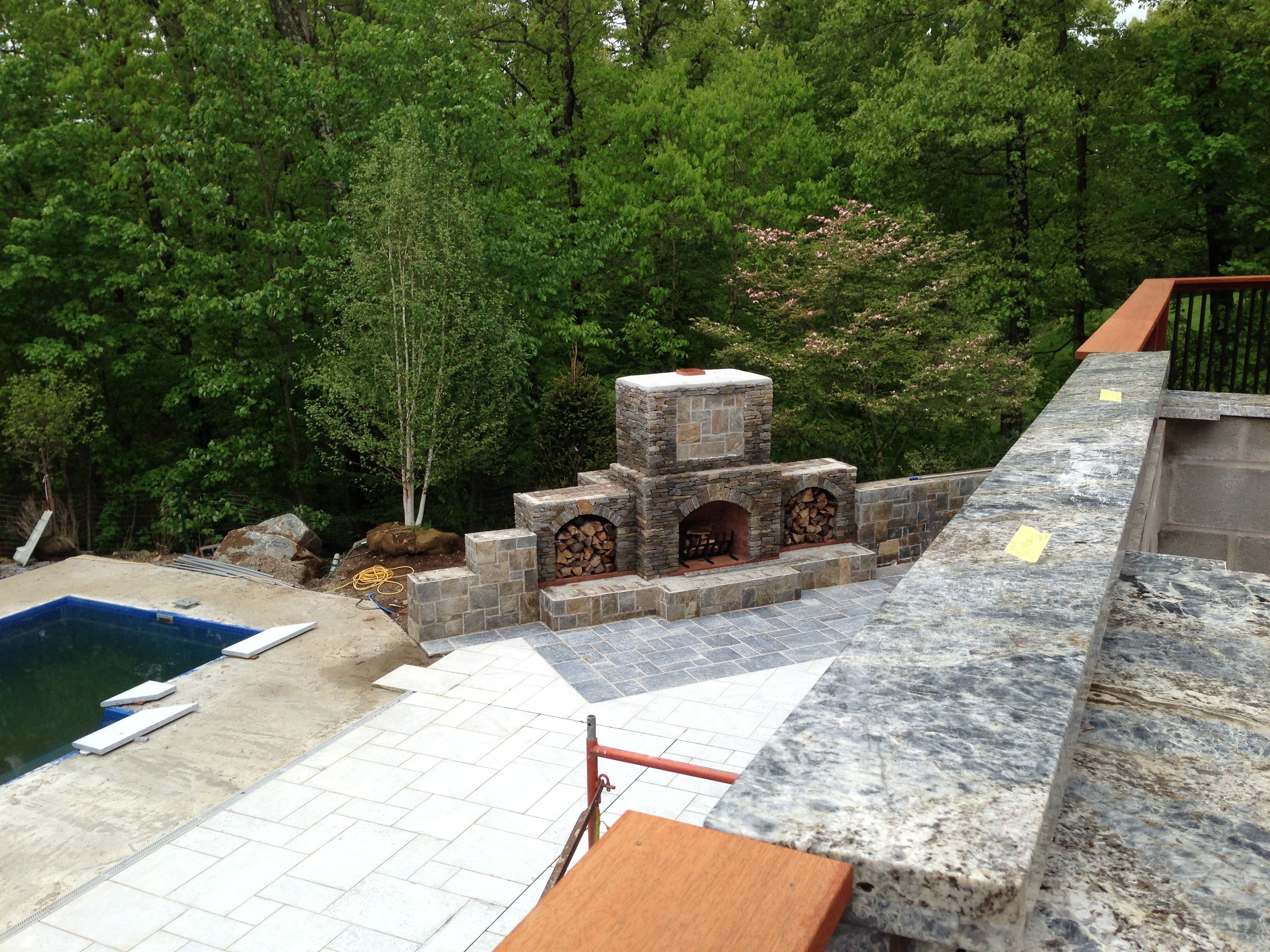 The catalyst for this tremendous outdoor kitchen upper stone island with large granite counter, separate outdoor sink island with TRUE refrigeration and Romeo and Juliet balcony over looking this magnificent Stone fireplace setting below. Lower level design ideas include fiberglass pool with raised sun deck and whale tail waterfalls below sprouting into the pool. All wrapped around in antique Blu Marble coping.