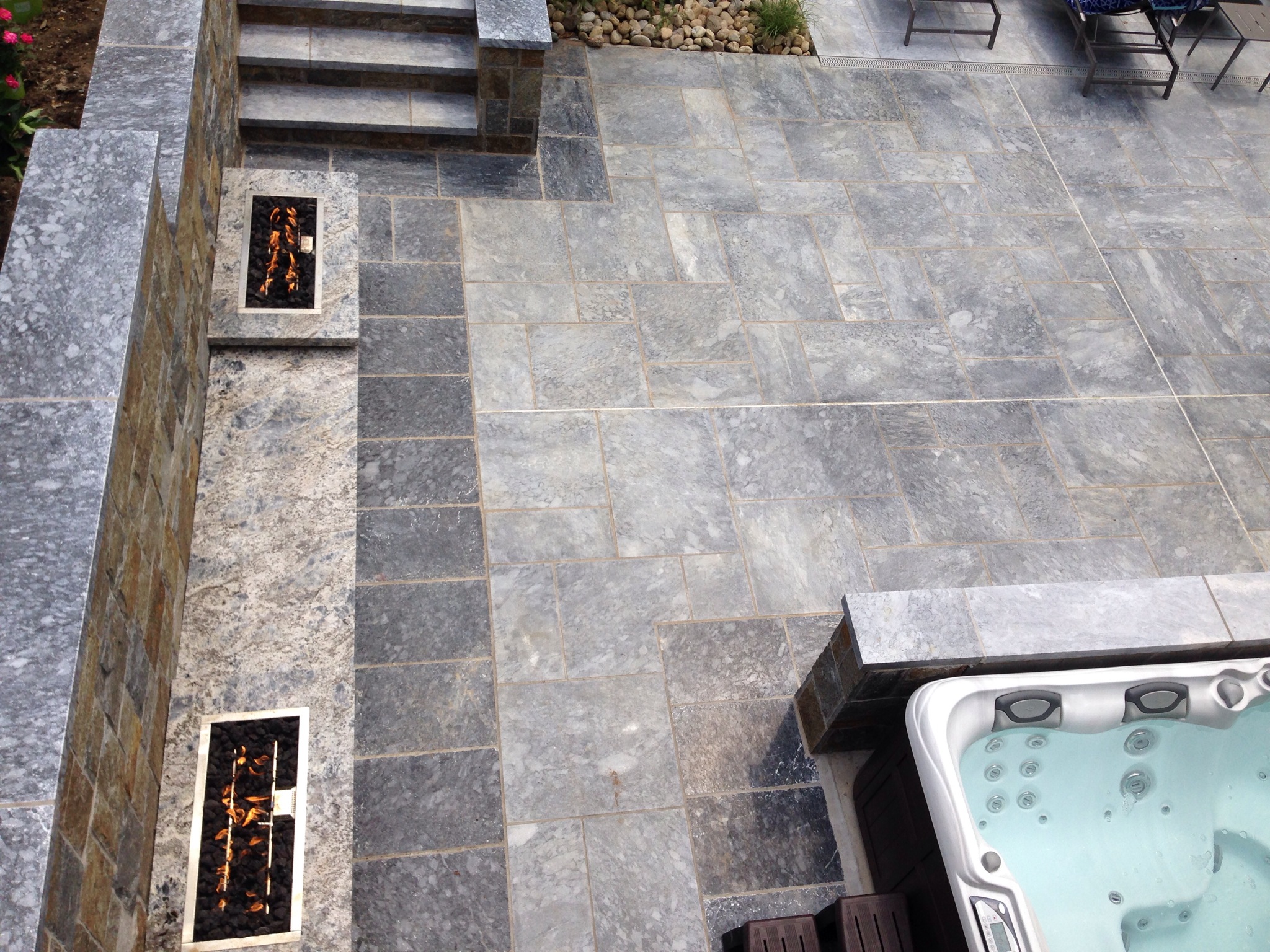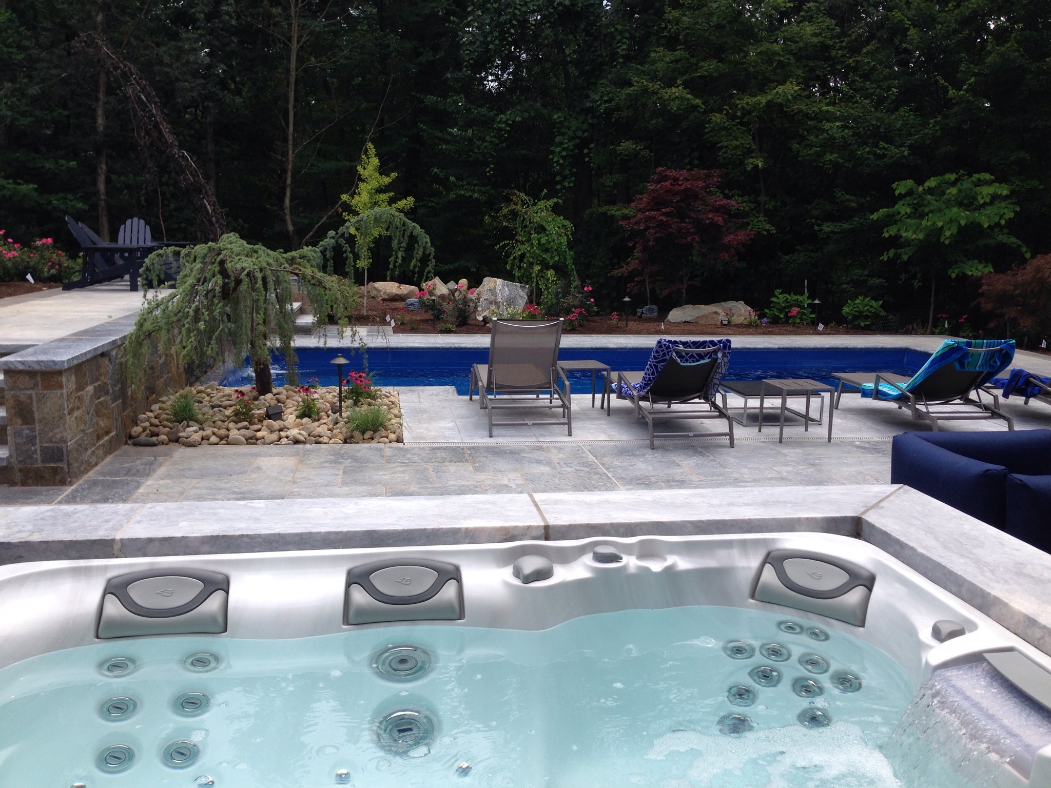 Outdoor living fabulously as seen here by outdoor living designer creates the Preferred lifestyle here with this outdoor shower, remote fire walls with granite bench by the hot tub. All close enough to the outdoor great room and pool