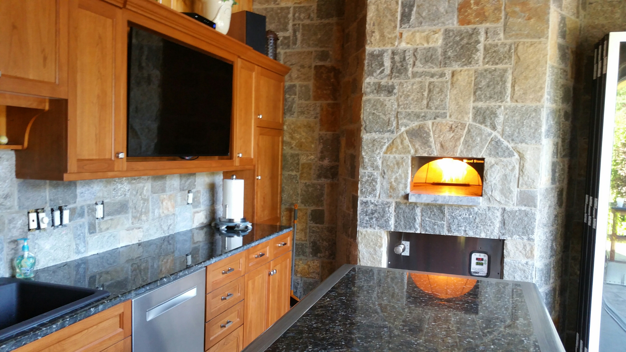 The installation of this propane fired Outdoor pizza oven requires due diligence from many professional tradesman including the propane fuel connection, electric service, carpentry, stucco, grease exhaust fan, copper flashing and chimney duct work in addition to the stone work and finish details.