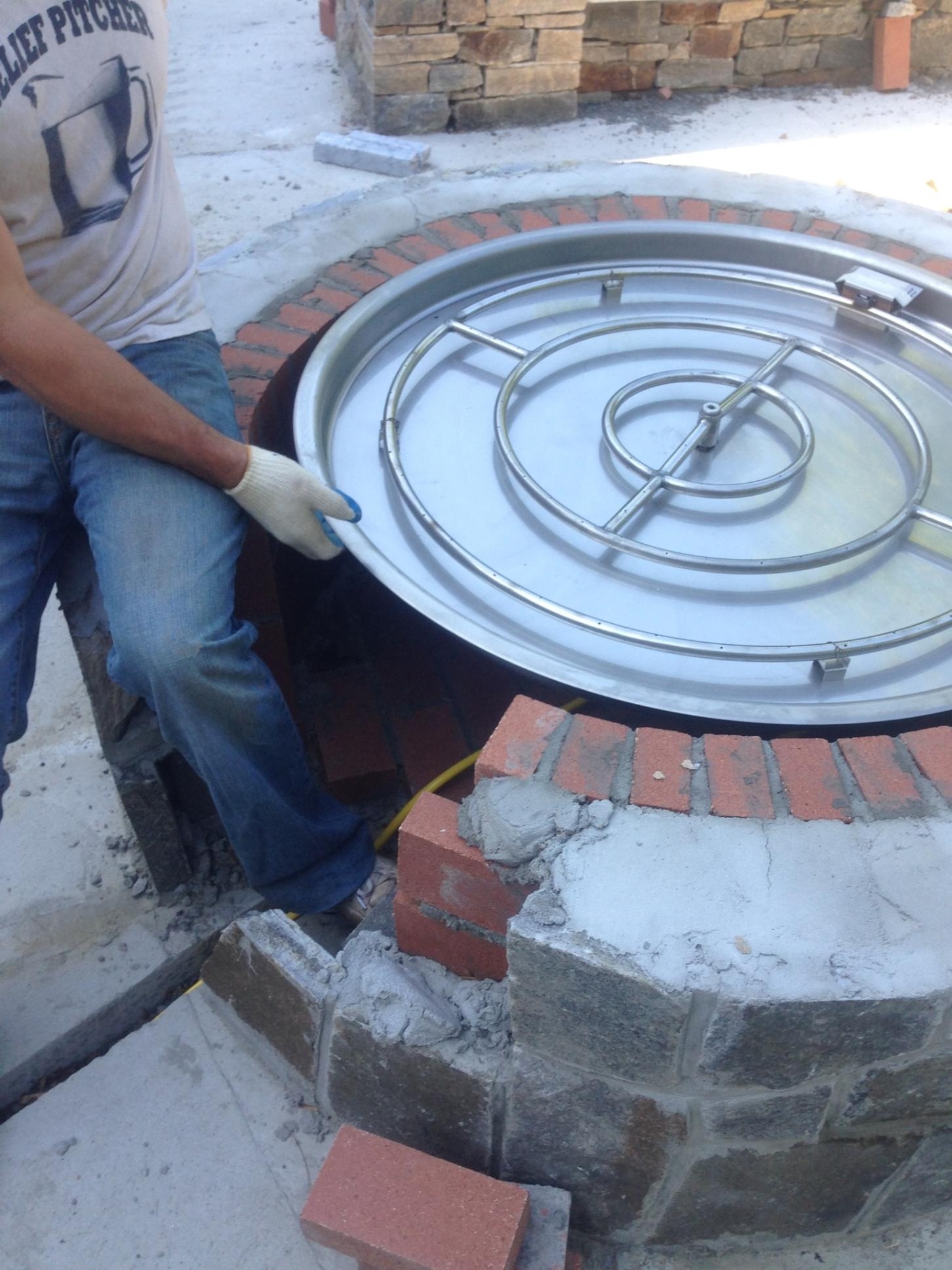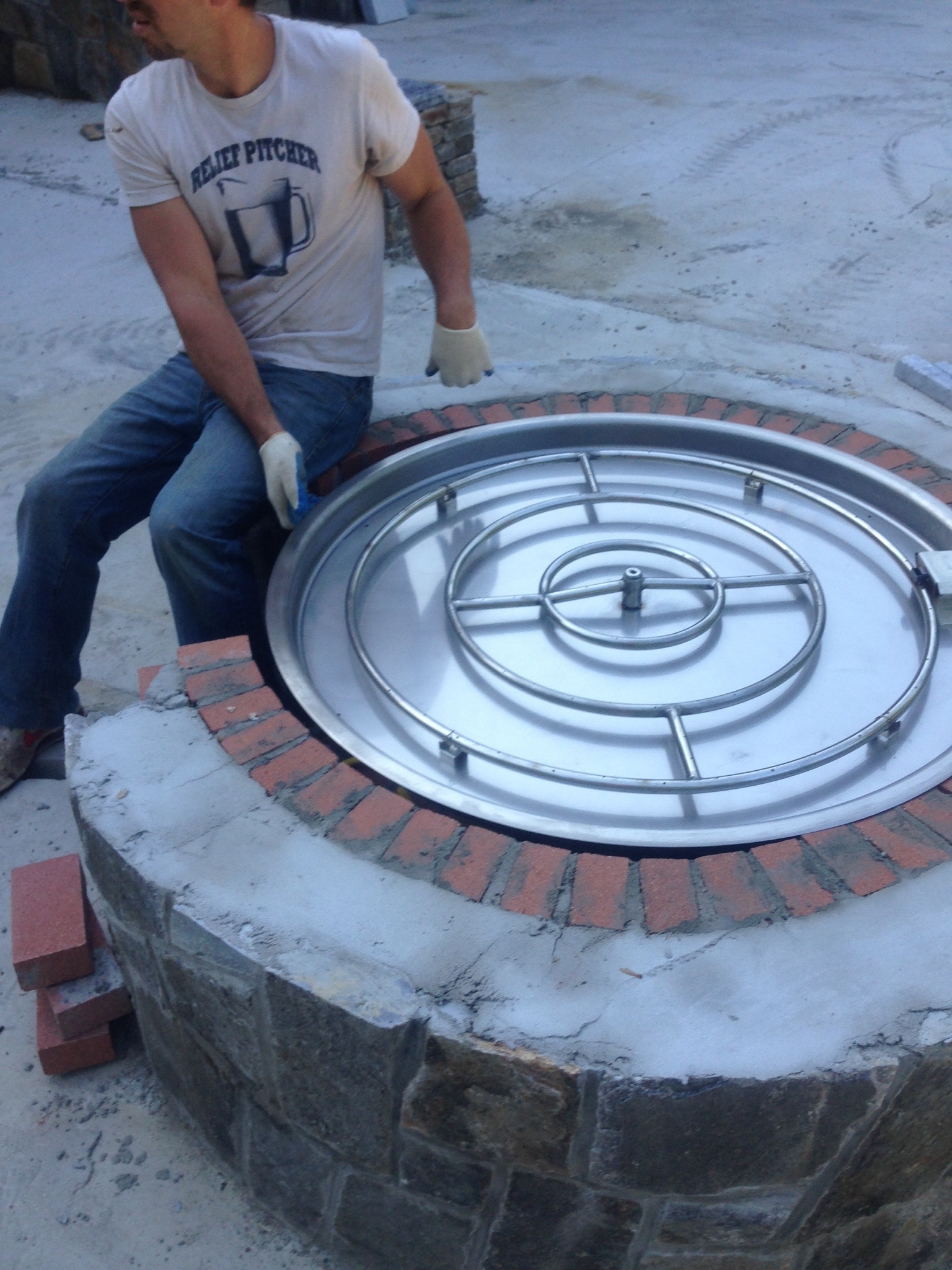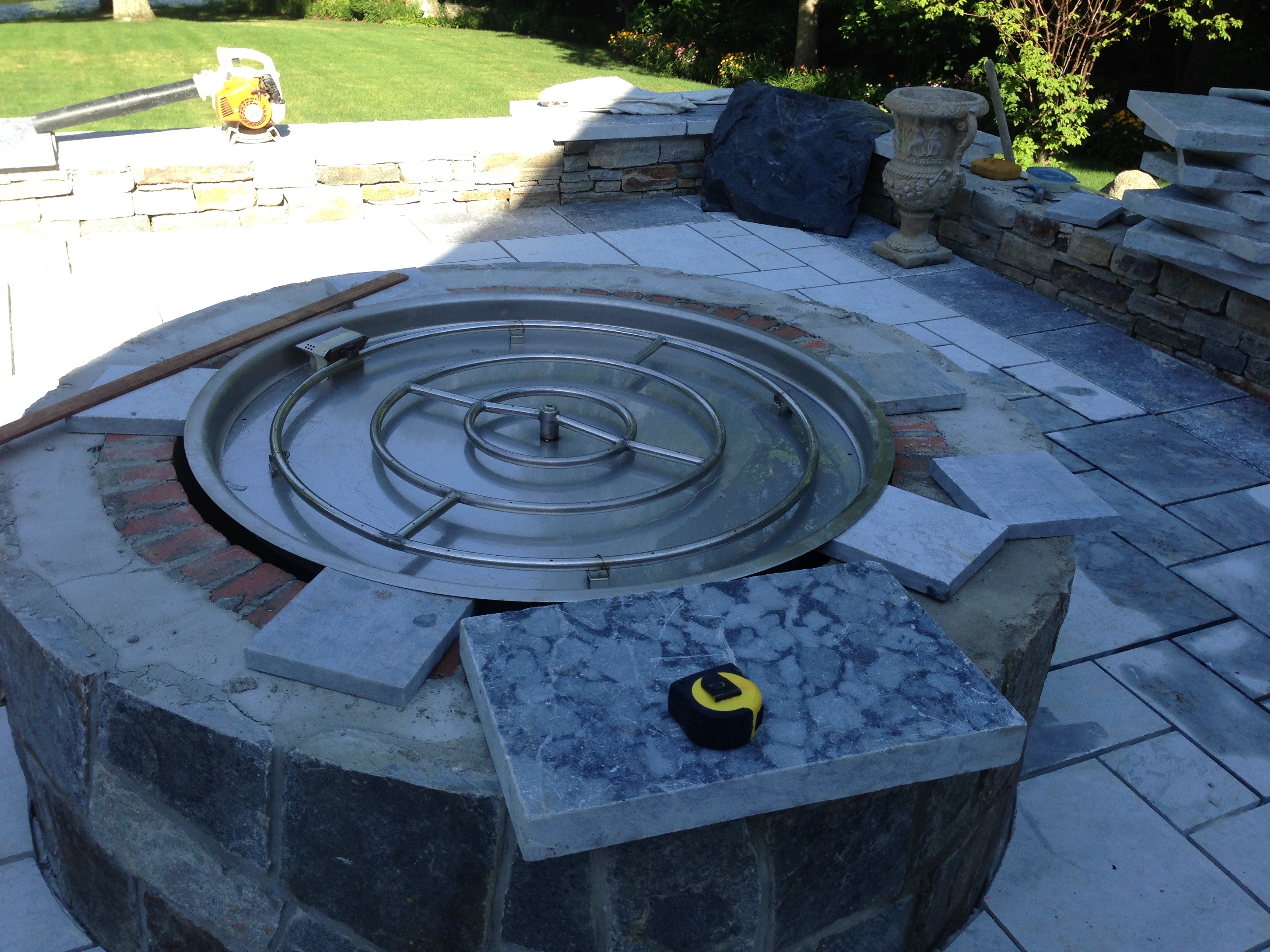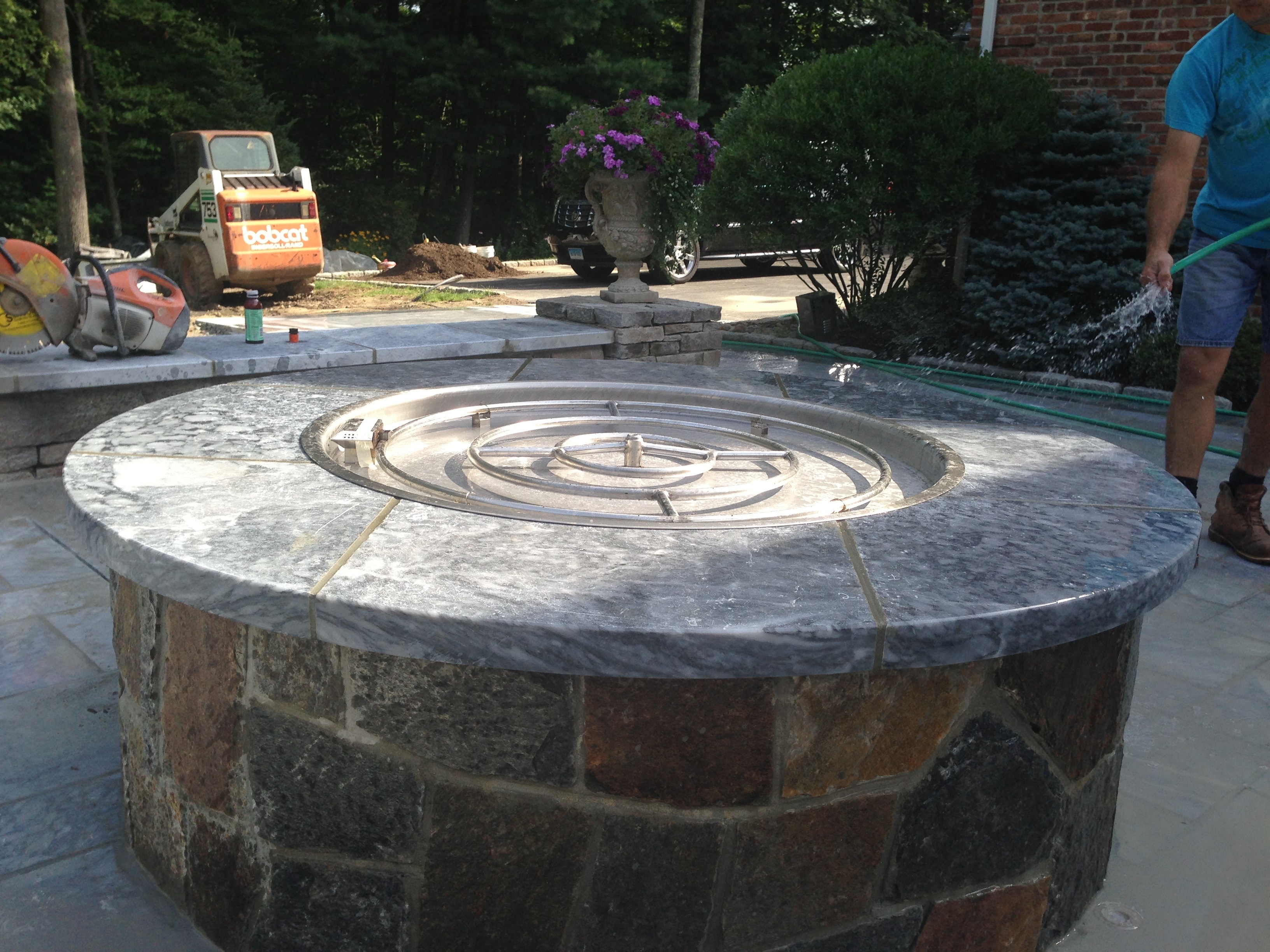 Here we show the building of this tremendous stone and marble gas fire pit adorned to match the rest of the stone outdoor kitchen and marble patio