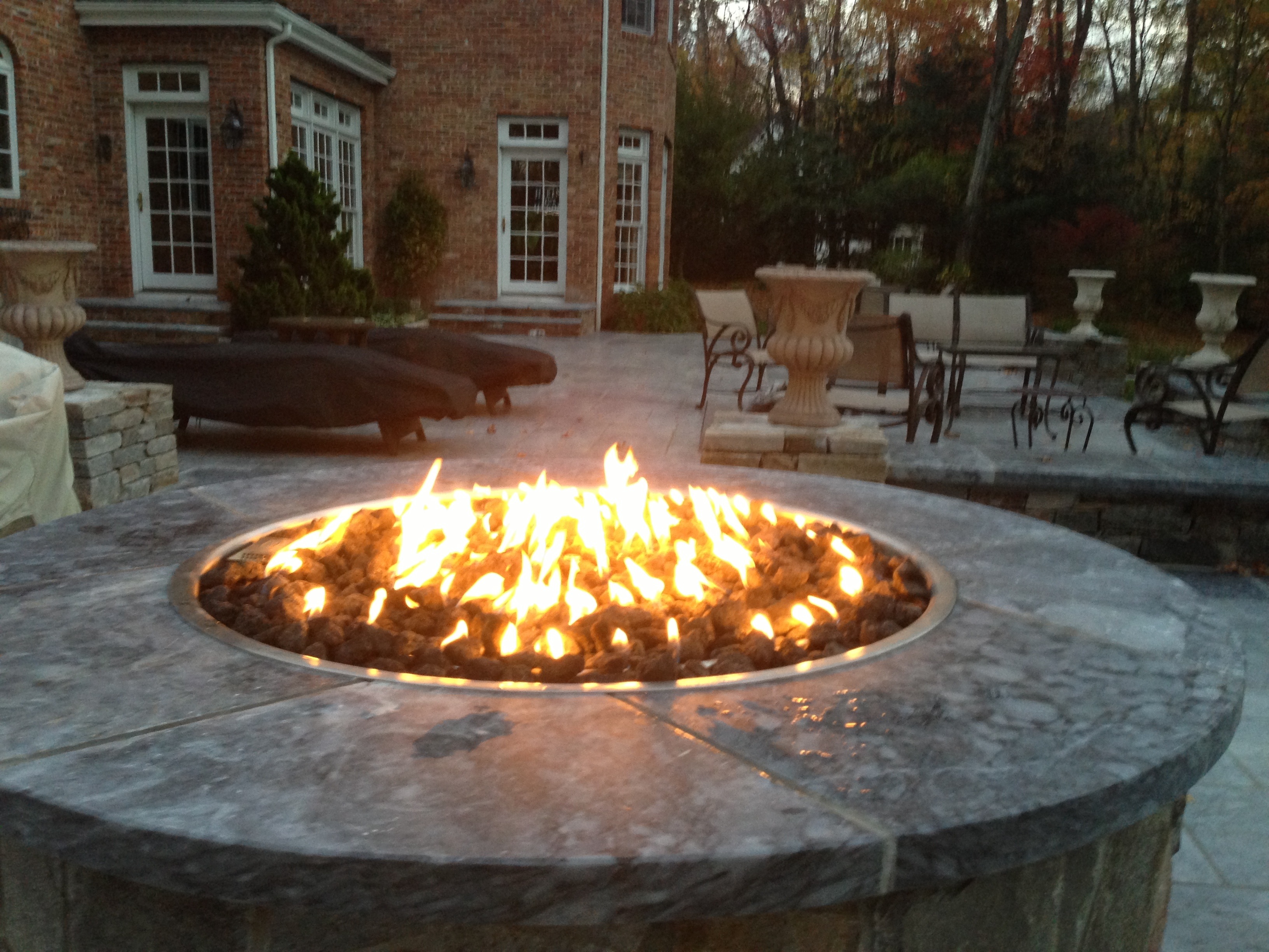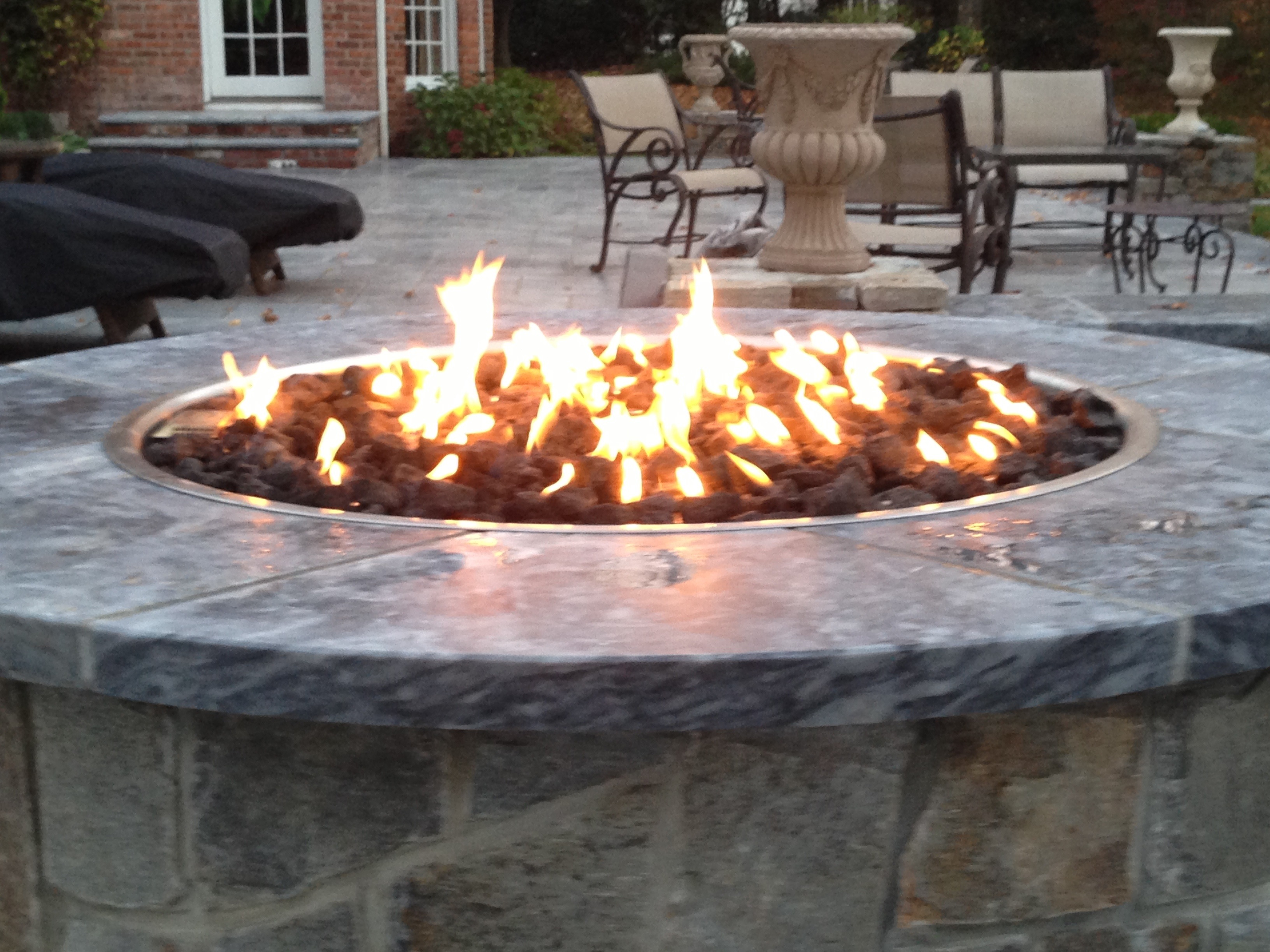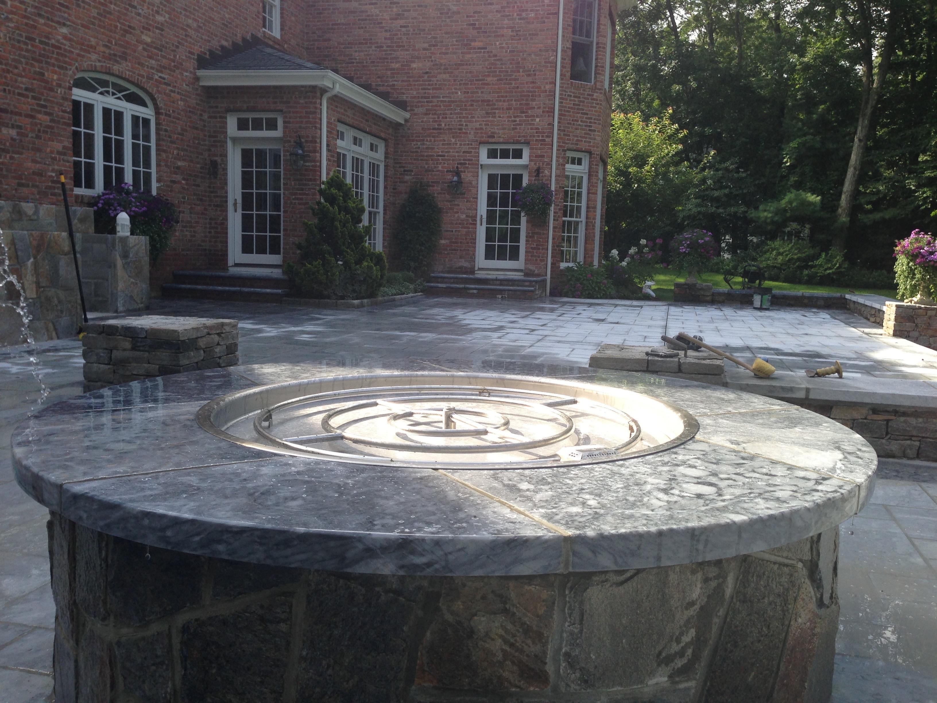 Later we will cover fireplaces but today the fire feature chosen to anchor this luxury marble patio setting complete with outdoor kitchen island was a remote gas fired fire pit. This stone and marble topped fire pit is the hit of the party. Clean and instant fire mesmerizes the crowd during all seasons all evening long.