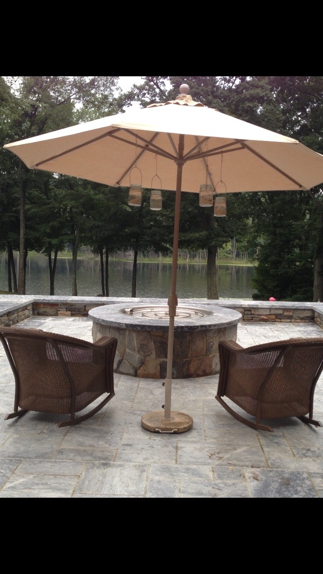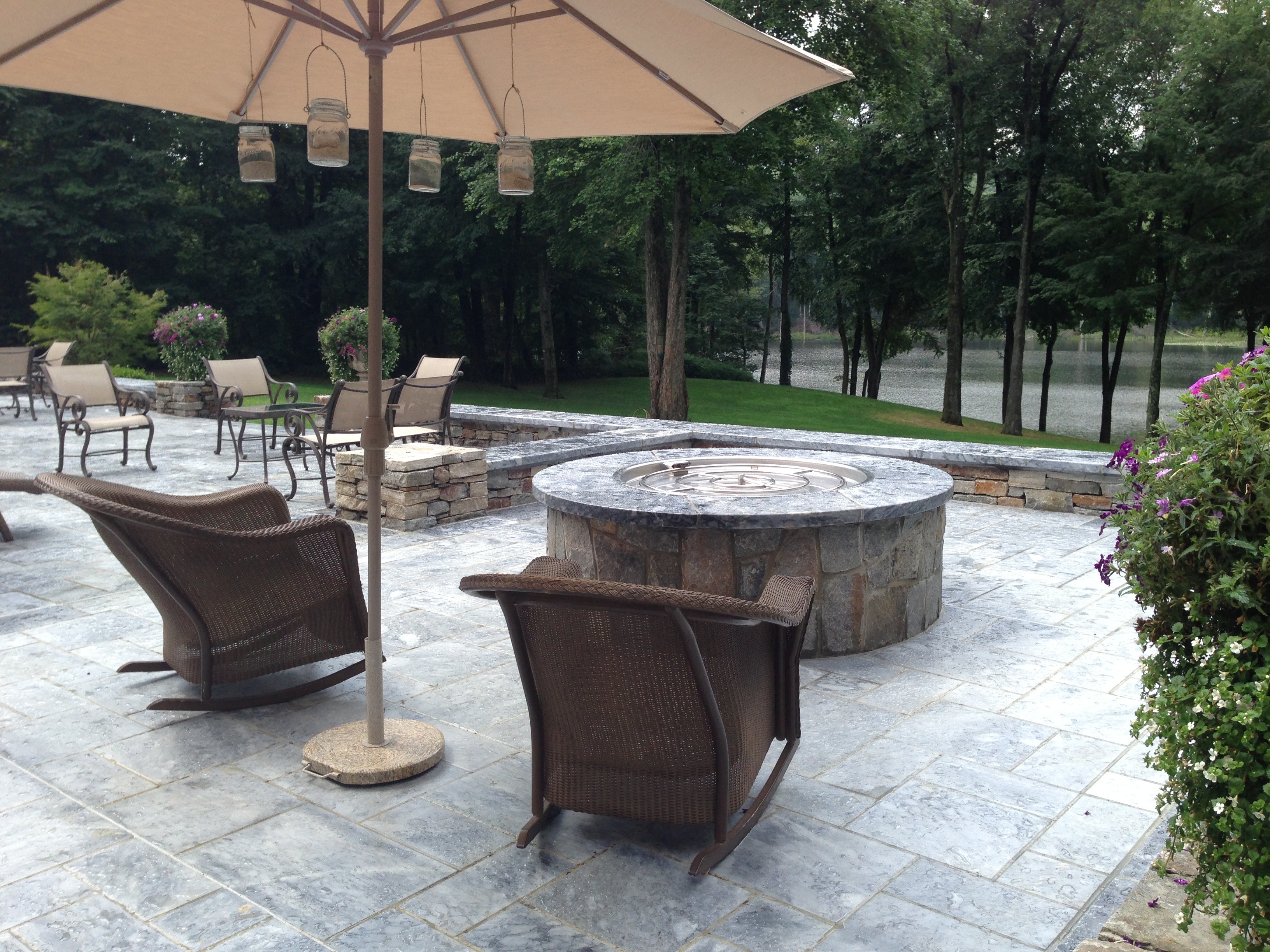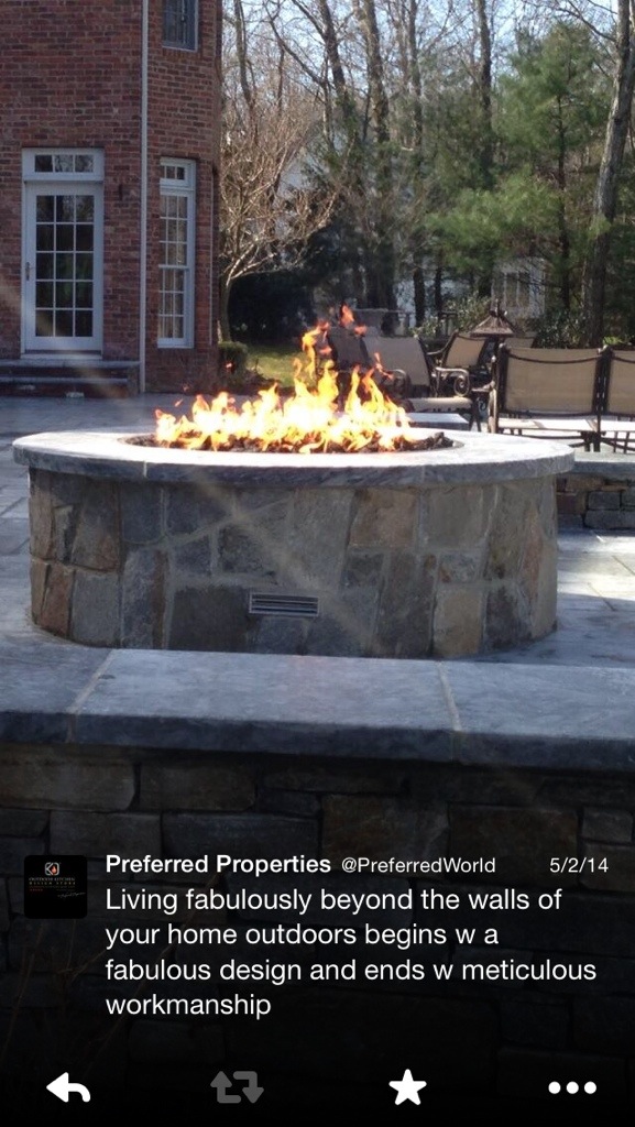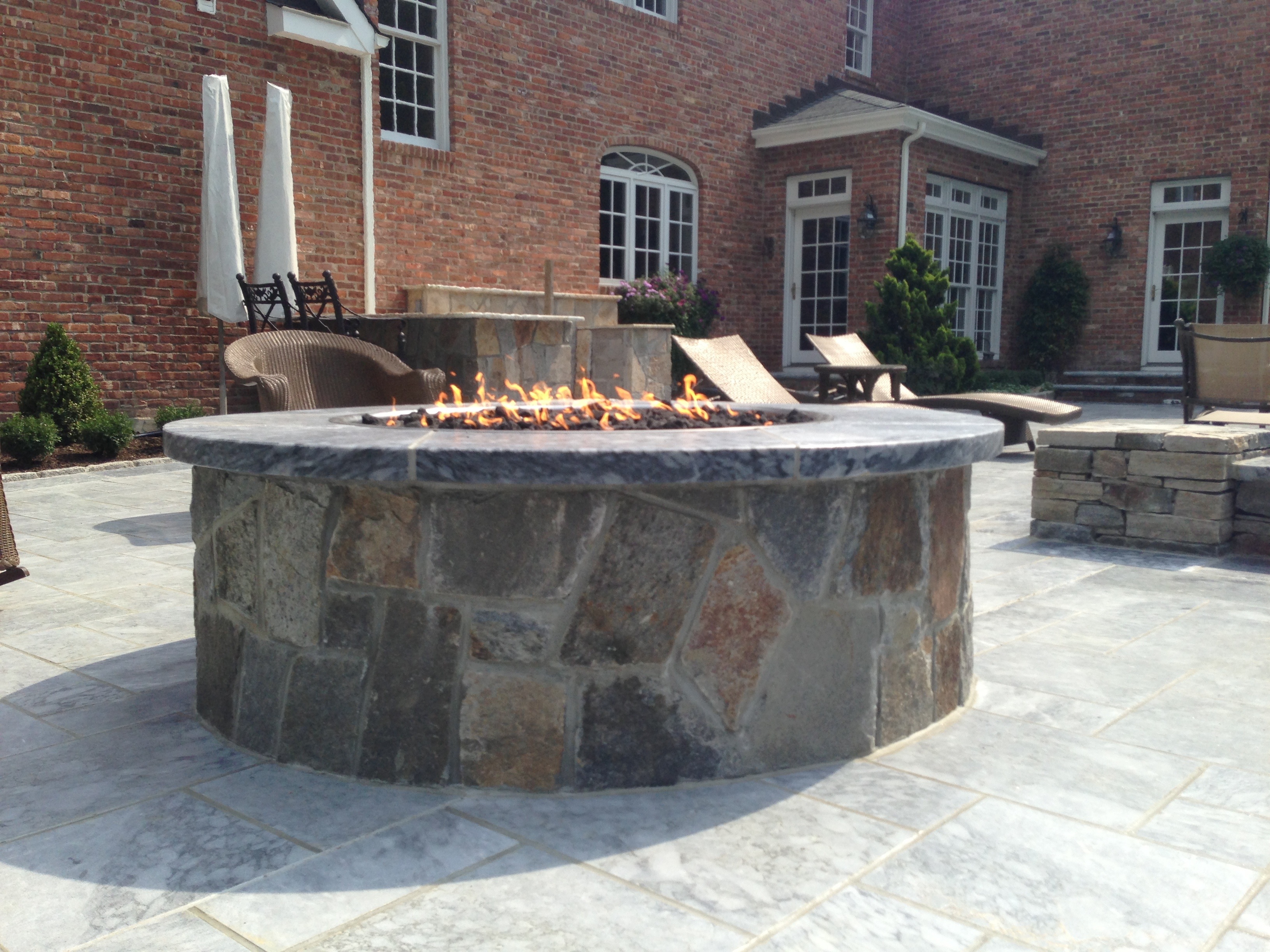 Later we will cover fireplaces but today the fire feature chosen to anchor this luxury marble patio setting complete with outdoor kitchen island was a remote gas fired fire pit. This stone and marble topped fire pit is the hit of the party. Clean and instant fire mesmerizes the crowd during all seasons all evening long.